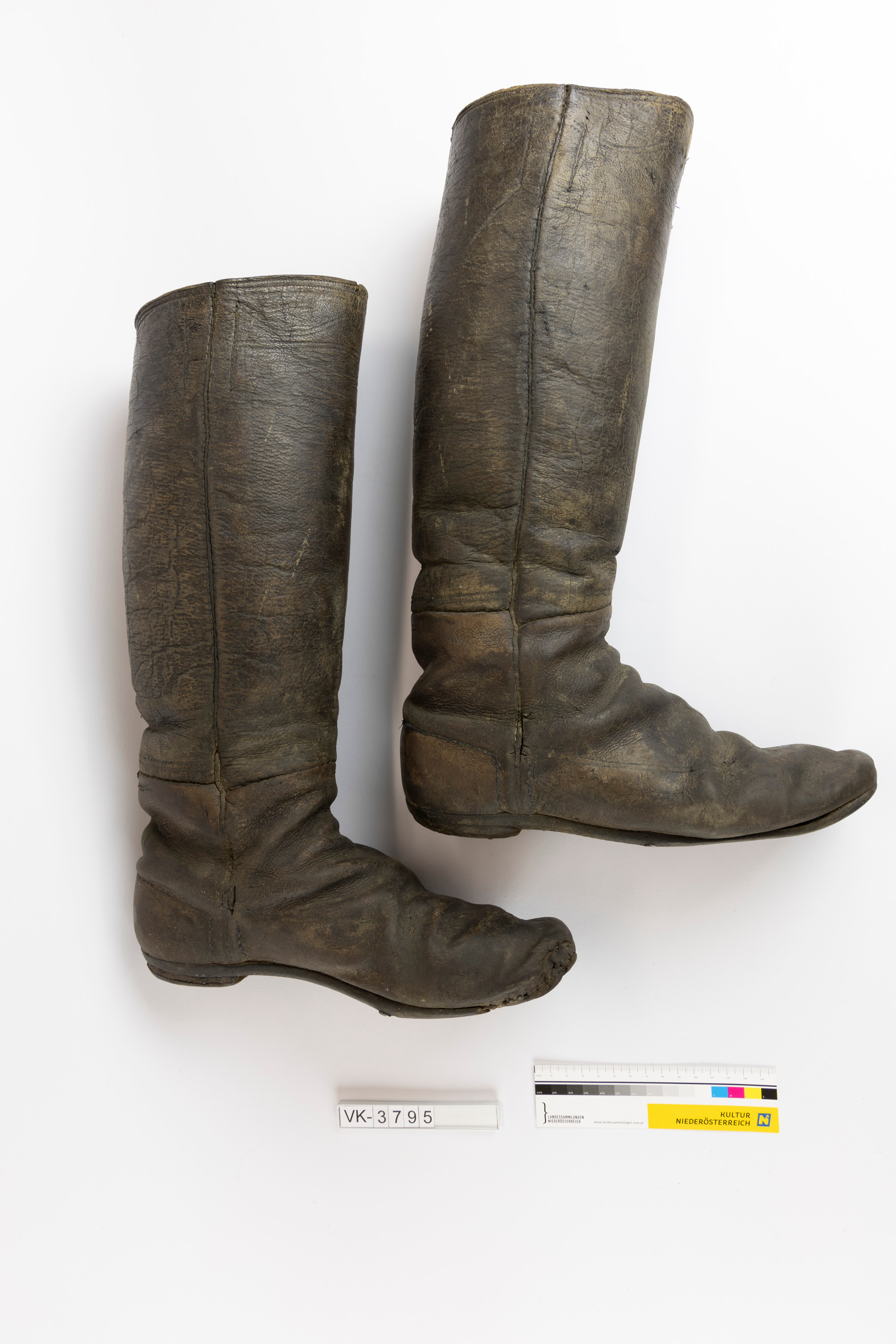 Ein Paar (a, b) hohe Herrenstiefel aus braunem Leder mit holzgenagelter Ledersohle und flachen Absätzen.