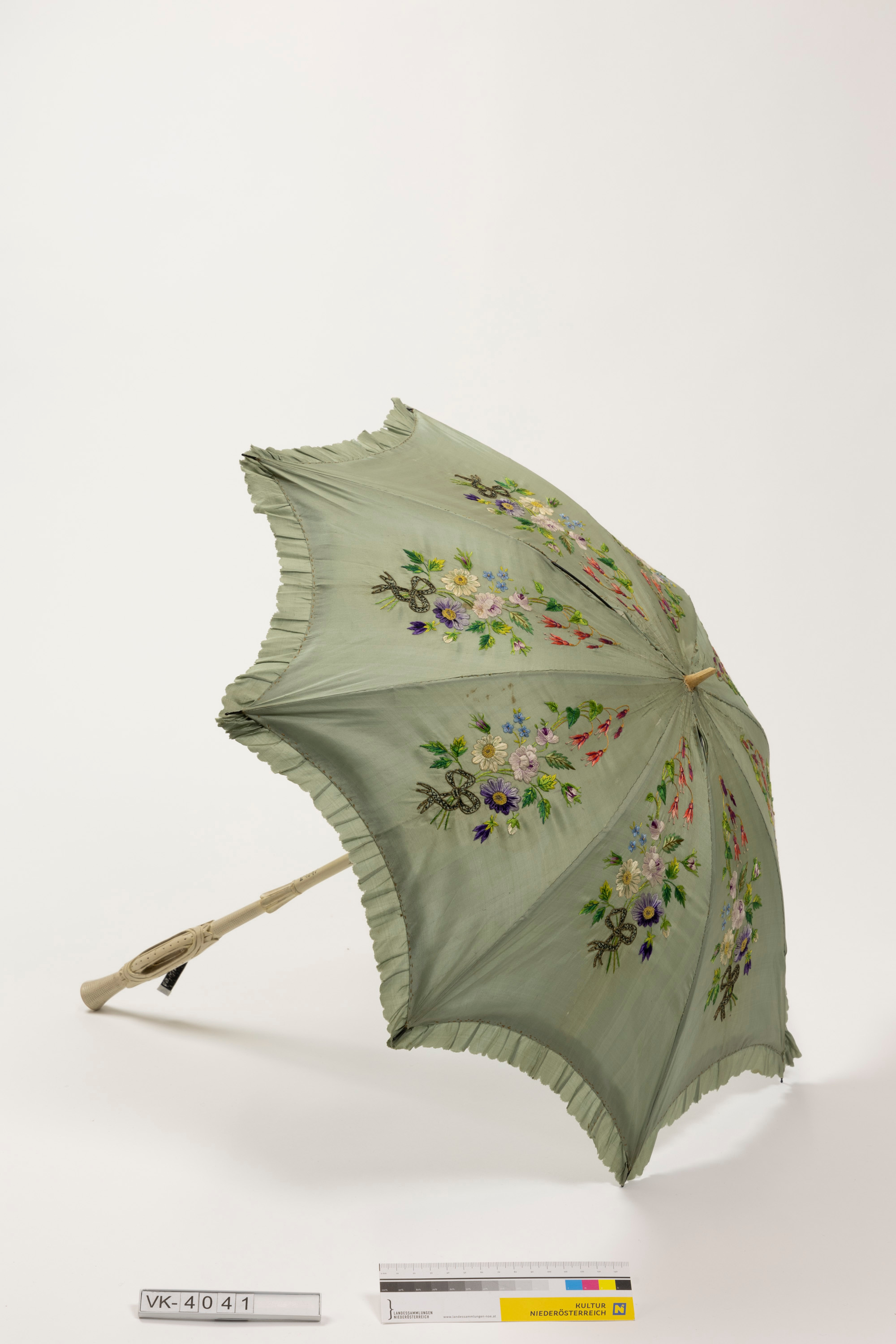 Sonnenschirm mit einer Holzstange, die in einen ornamental mit einem Durchbruch beschnitzten Griff übergeht, einem Metallgestänge und einer grauen Bespannung mit mehrfärbiger Bestickung (Blüten mit Blattwerk).