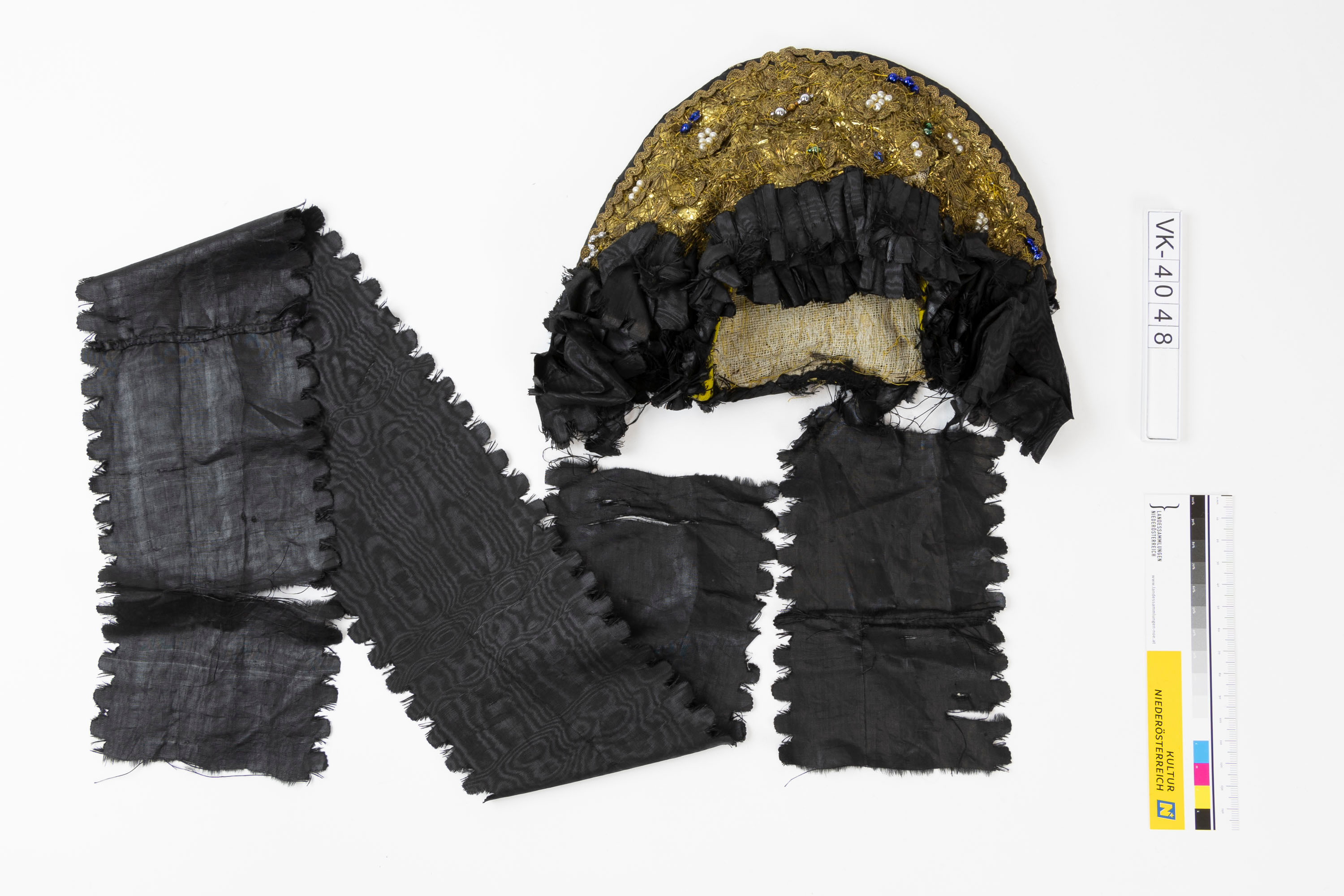 Drahtverstärkte Haube mit schwarzen Bändern aus Moiree (Ränder in Bogenmuster geschnitten). Die Haube ist mit Goldblech und Silberlitzen benäht und mit bunten Glasperlen bestickt.