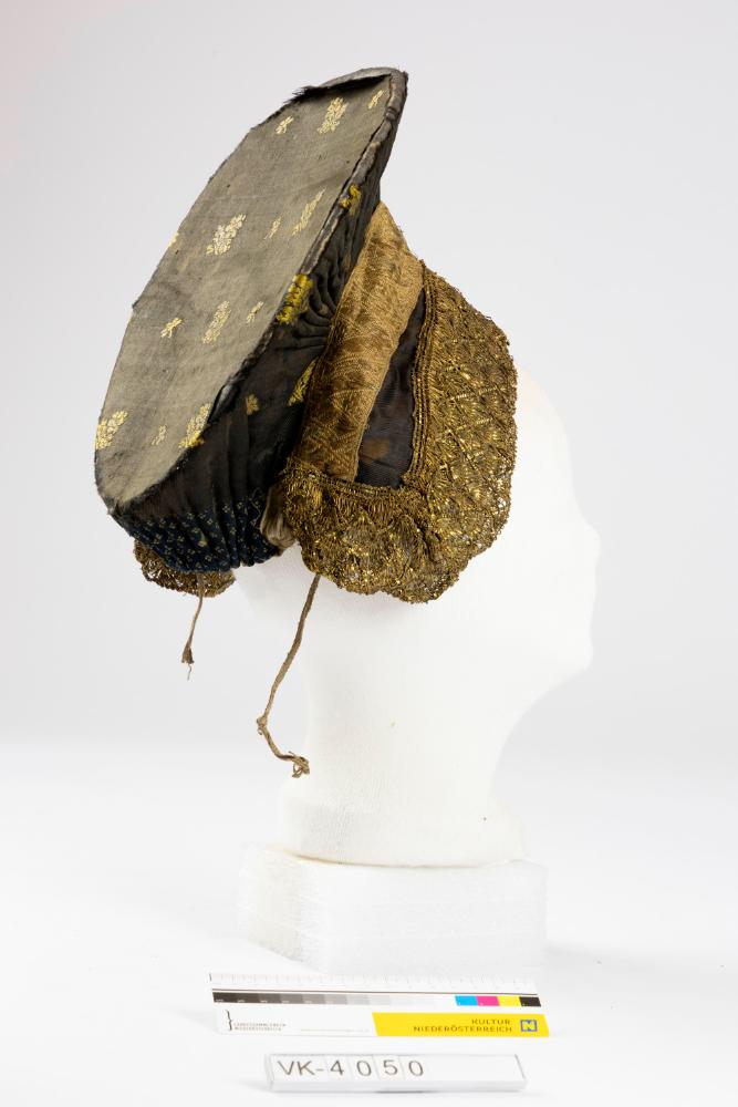 Radhaube ("Brettlhaube") aus braunem Seidebrokat mit goldenem Blütenmuster, am Kopfteil mit Goldborte besetzt, mit Goldspitzenrand. Die Haube ist mit Leinen gefüttert und hat Bindebändchen. 9/2018: Standort unklar (Zettel vorgefunden, entnommen dch. G.)