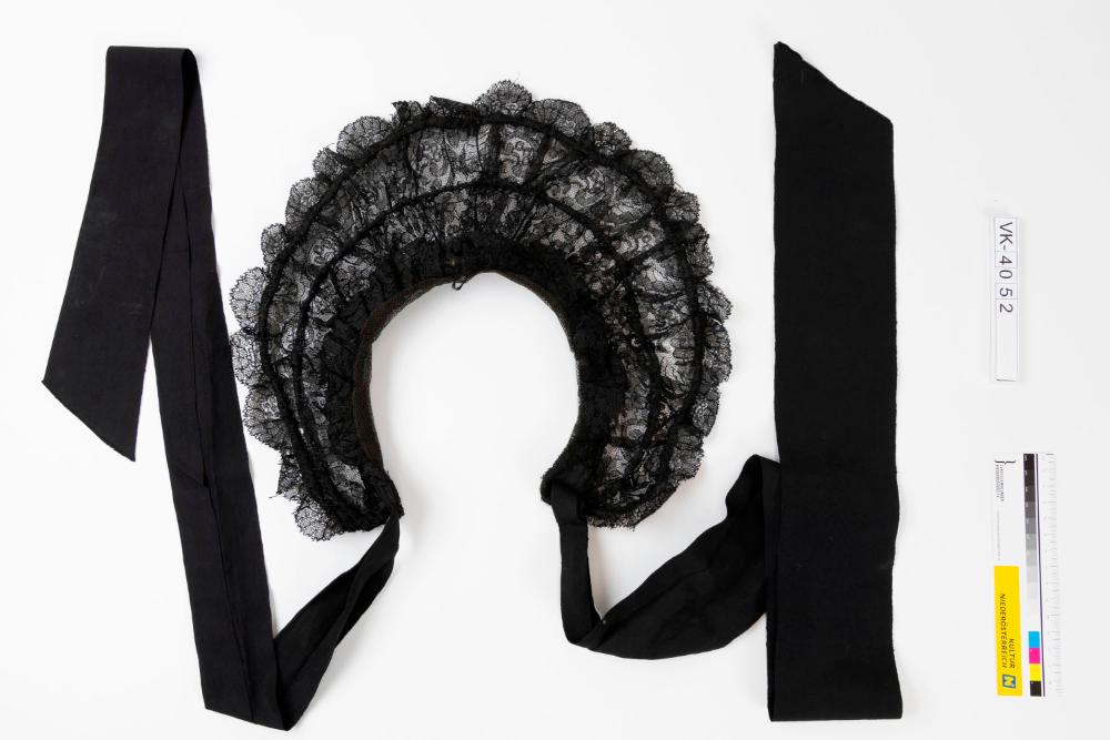 Radhaube (Rad) aus schwarzer Tüllspitze mit einem schwarzen Ripsband. Im Kopfbereich ist die Haube mit Draht verstärkt.