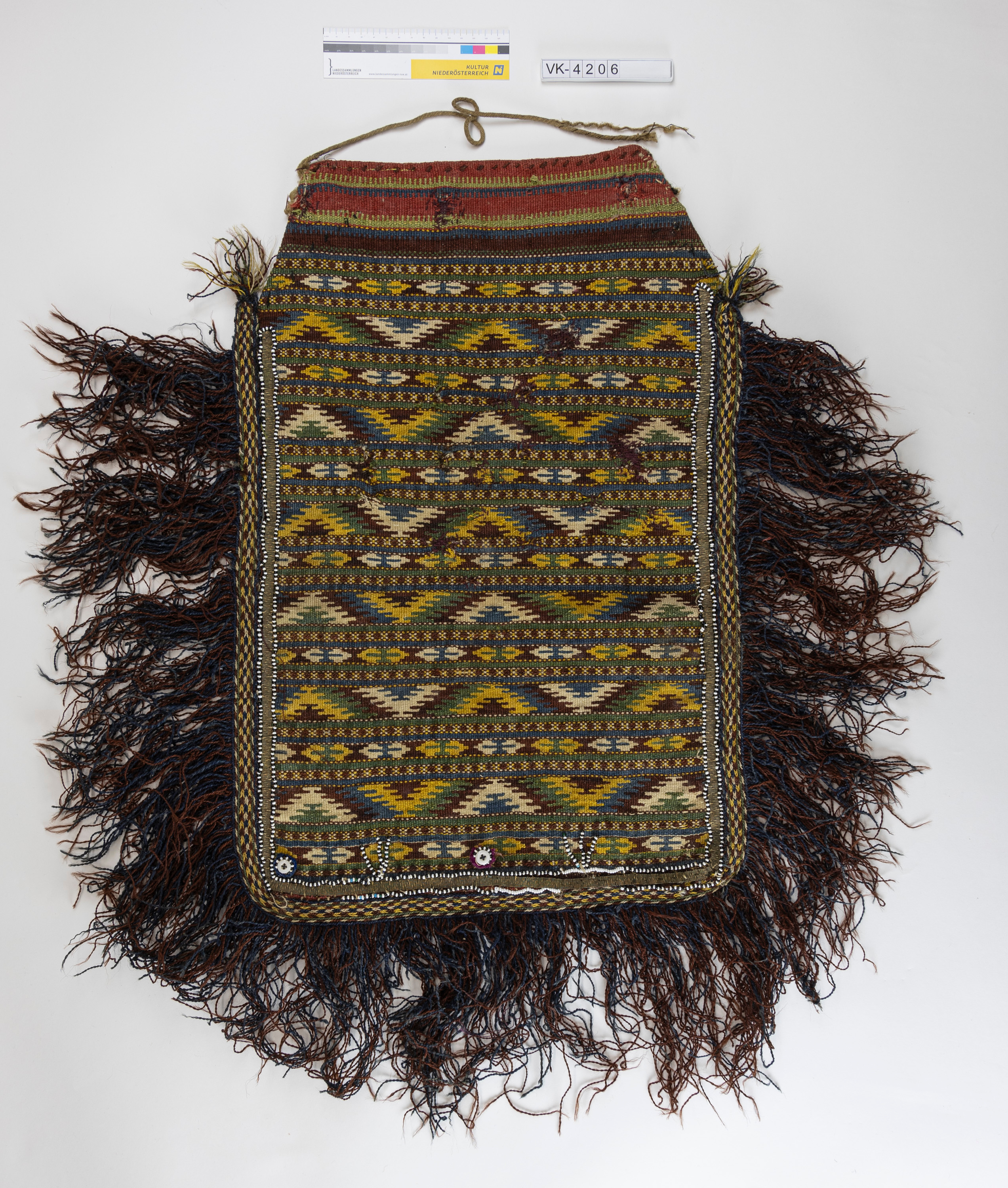 Rechteckige Kelimdecke mit einem geometrischen Muster in grün, braunrot, blau und gelb; die Decke hat an drei Seiten eine Glasperlenborte und lange mehrfärbige Wollfransen. Die Decke war möglicherweise für einen Sessel.