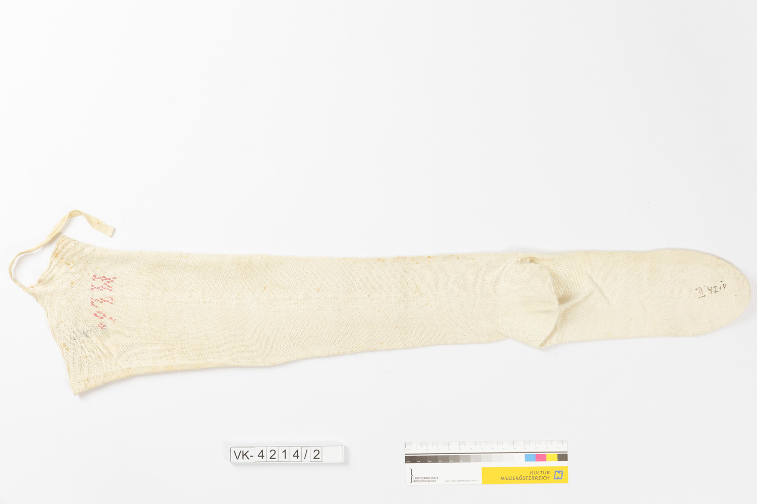 Ein weißer Baumwollstutzen mit rosa Bestickung: "ML 6".