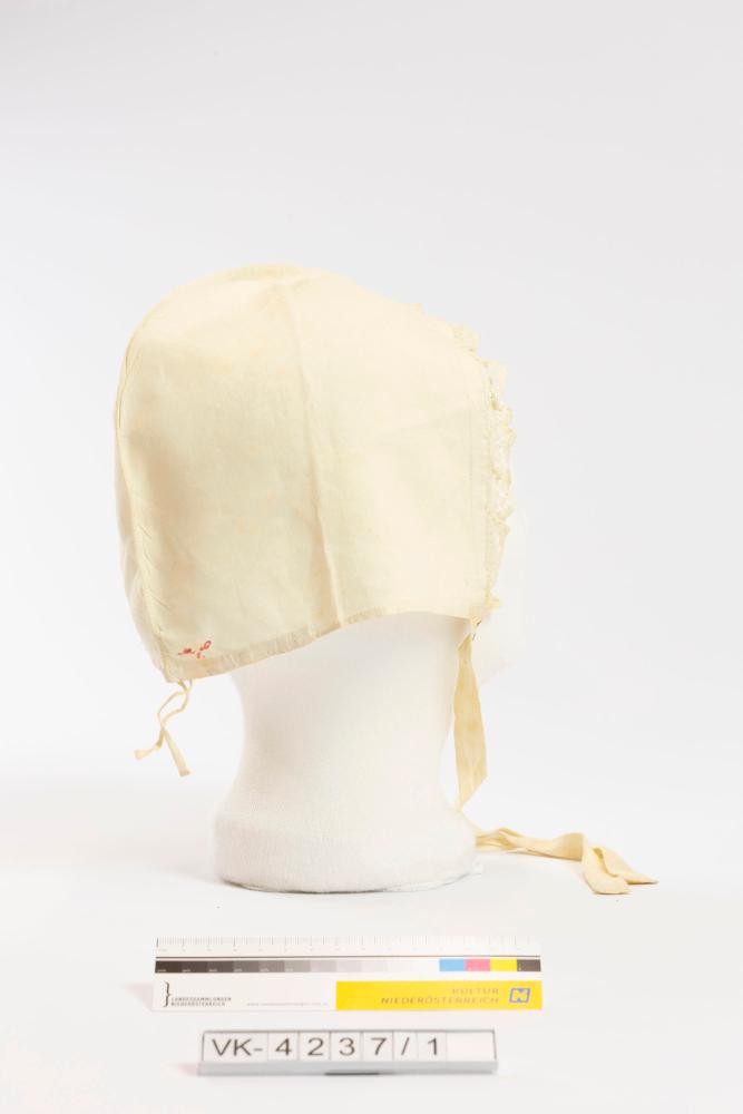 Runde glatte Leinenhaube mit Scheitelnaht, kleinem Nackendurchzug und einem Spitzenrand aus Zackenklöppelspitze. Mit Kreuzstich ist ein rosa Monogramm eingestickt: "ML 1".