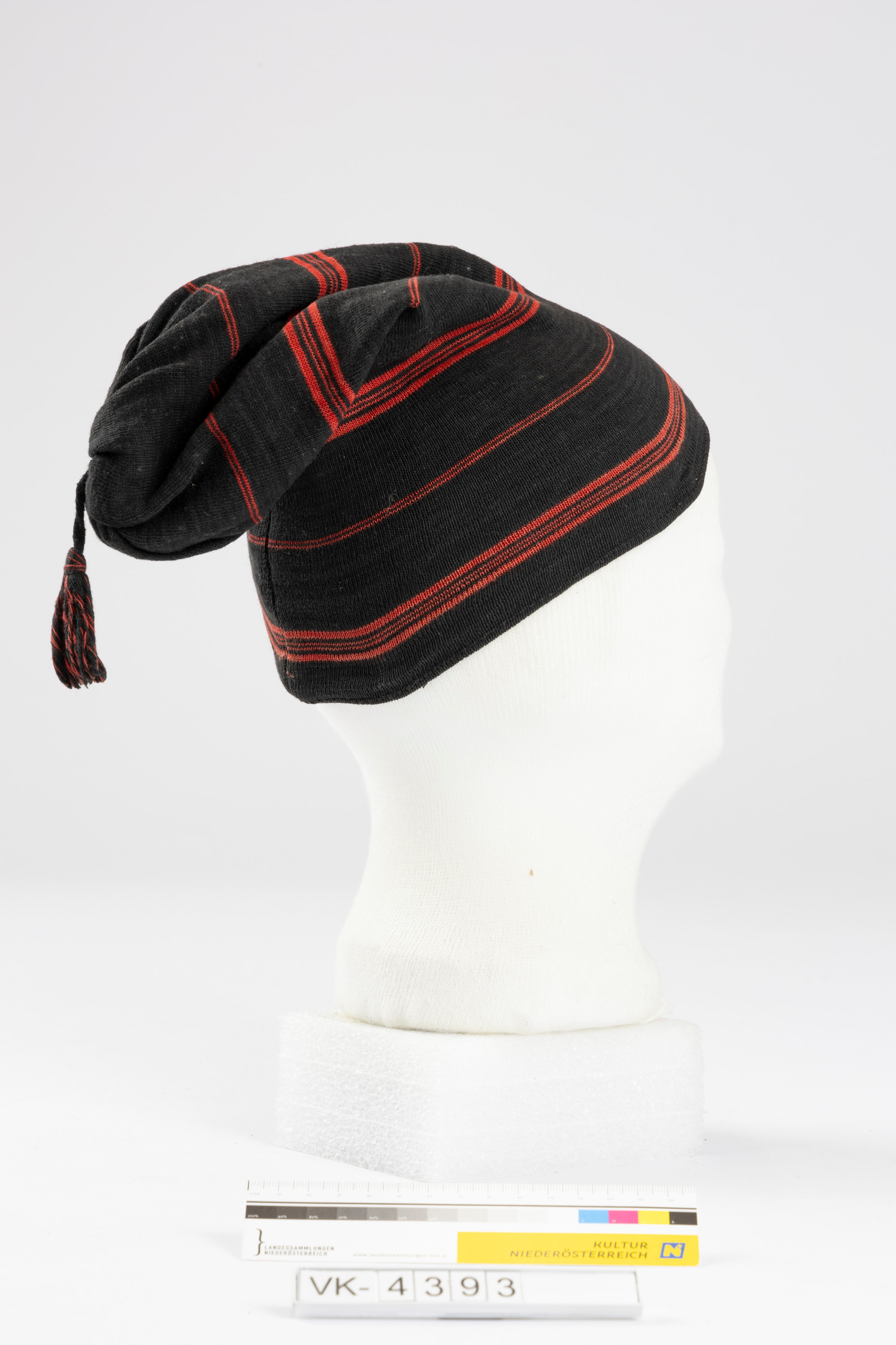 Schwarze Strickmütze mit breiteren und schmäleren roten Streifen, mit einer schwarz-roten Quaste.