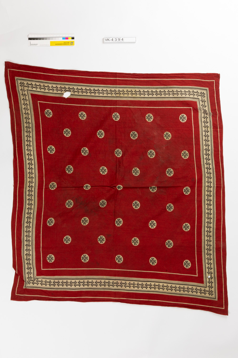 Rotes Baumwolltuch mit schwarz-grauem Muster: Im mittleren Bereich helle Punkte mit Doppelkreuzen, am Rand eine Musterborte.