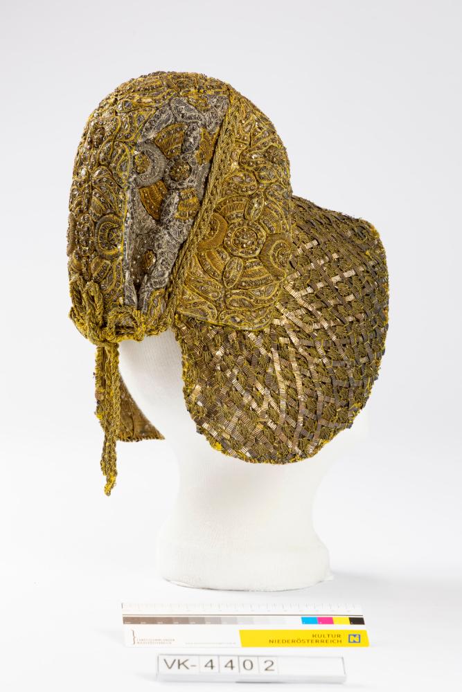 Drahtverstärkte Wiener Goldhaube, vollflächig mit Goldreliefstickerei, Golddrahtspitze und Pailletten verziert (seitlich teilweise silber). Die Haube hat einen Nackenzug mit geflochtenen Goldbändchen. Die Haube ist teilweise mit rosa Taft und teilweise mit weißem Feinleinen gefüttert. Innen ist die Haube handschriftlich beschrieben.