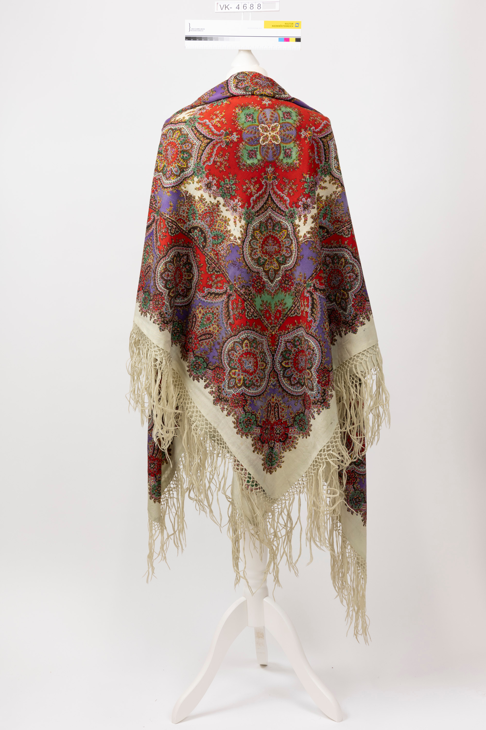 Großes Schultertuch aus feiner beiger Kaschmirwolle mit großflächigem, mehrfärbigem, orientalischem Muster und geknüpften und vernetzten Wollfransen.