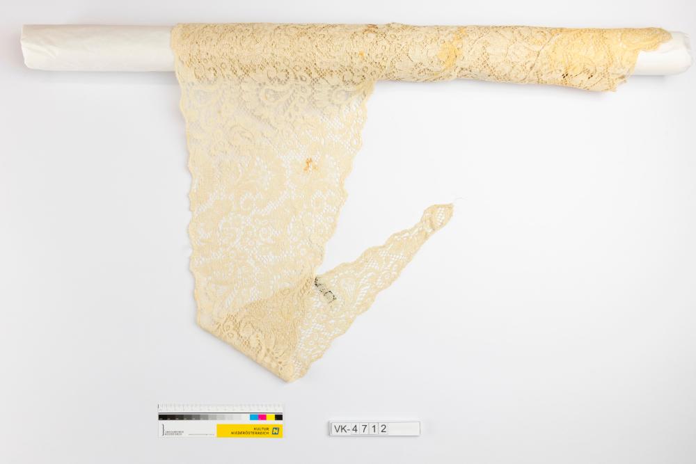 Dreieckiges Kopftuch aus beiger, ornamental-floral gemusterter Nadelspitze, mit Bogenrändern.