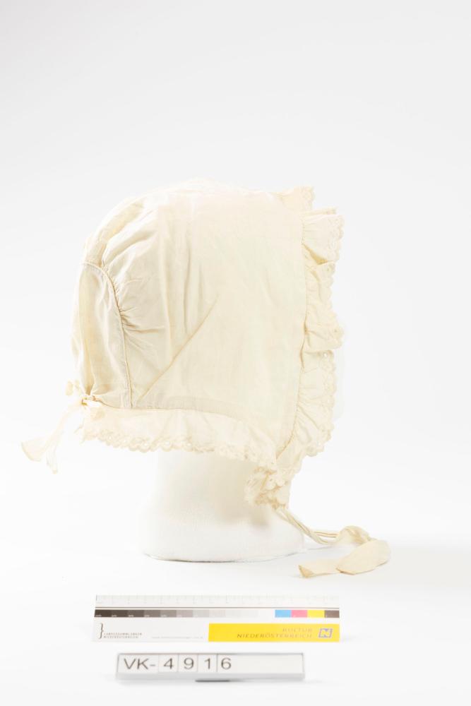 Weiße Schlafhaube mit Köperbändern und gelocht gemustertem Rüschenrand.
