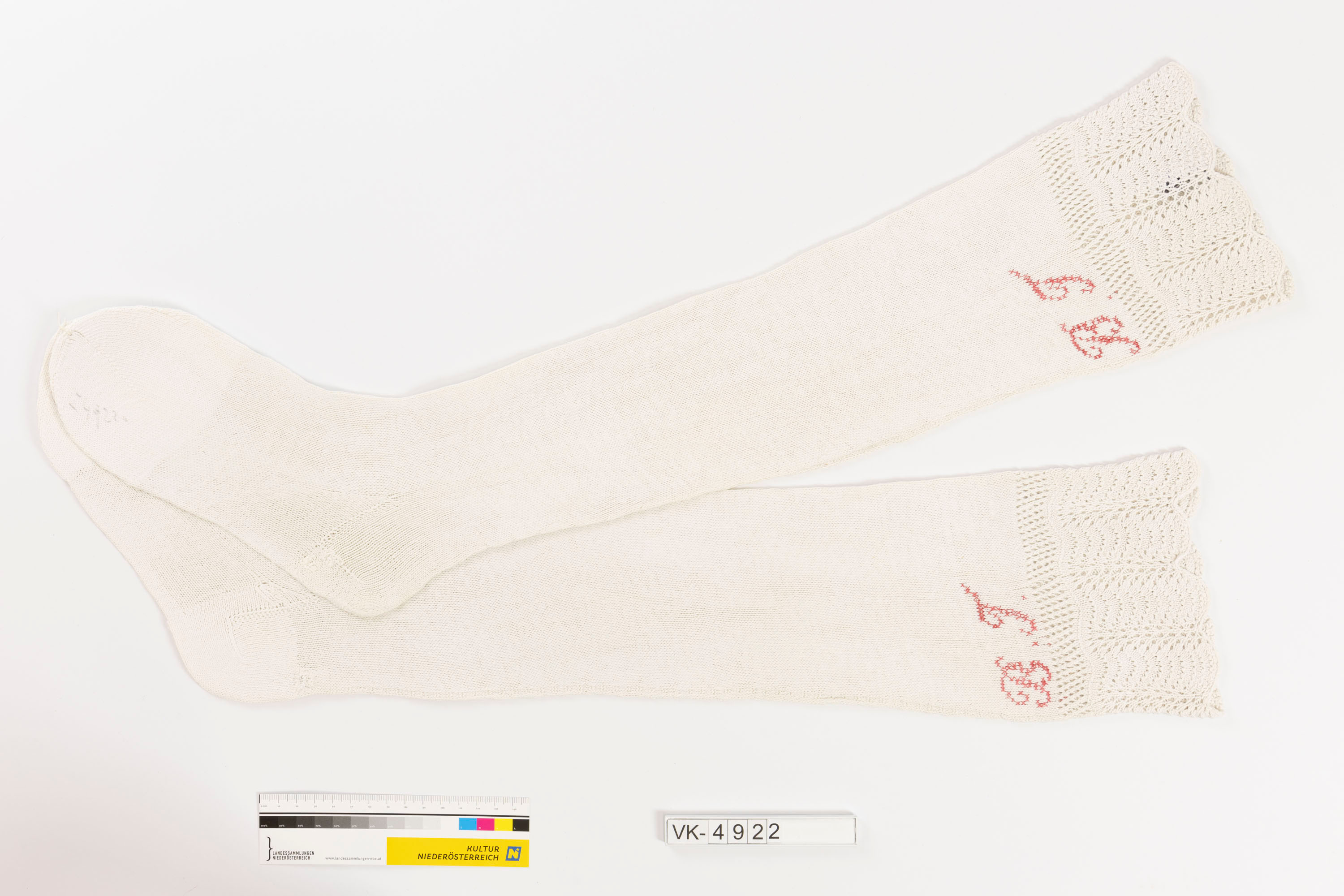 Ein Paar (a, b) weiße Baumwollstrümpfe mit Lochmusterstreifen und gewelltem Rand, mit einem roten Garn bestickt: "BT".