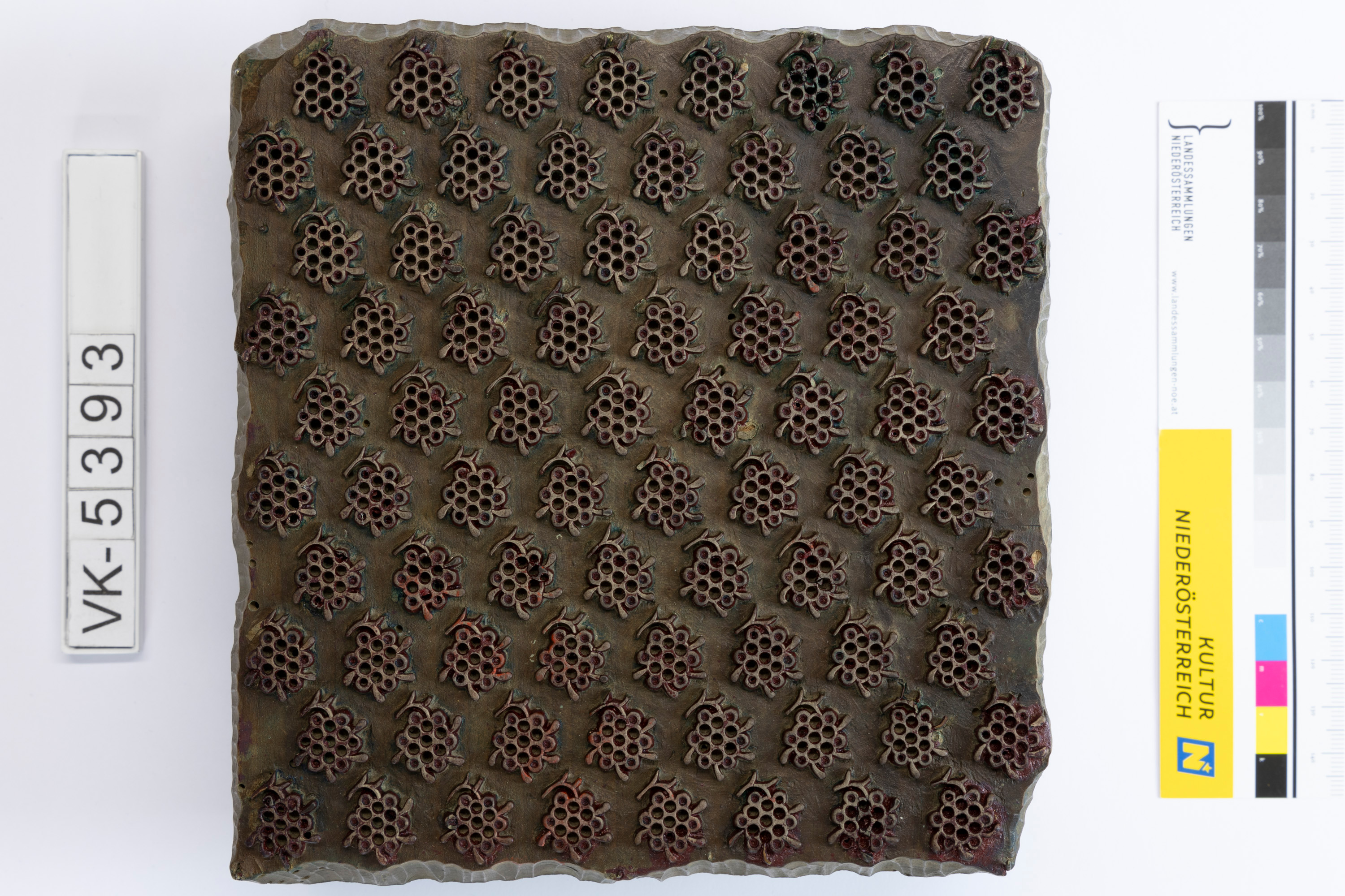 Färbermodel aus Holz mit eingeschlagenen Metallstiften auf einer Trägerplatte mit zwei Kerben. Druckmuster: Viele kleine Blüten. Das Model weist Farbreste auf. (Muster Nr. 83 des Druckers).