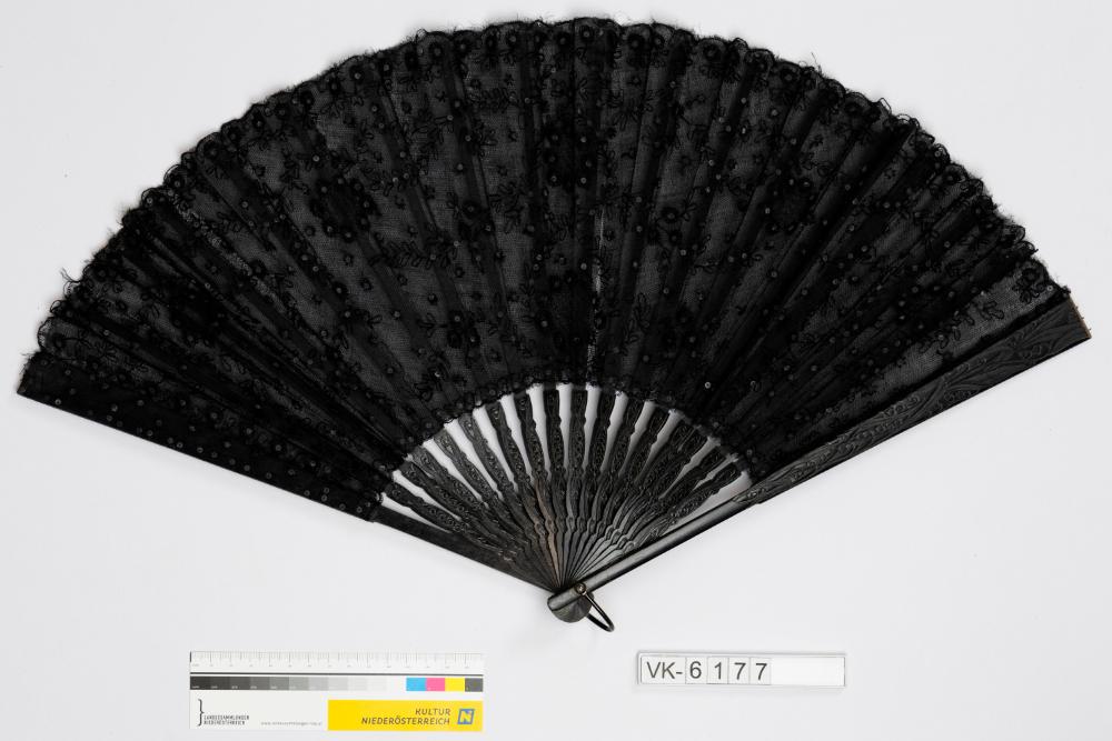 Schwarzer Fächer mit floral beschnitzten Deckkappen und Fächerbögen, bespannt mit Tüll. Die Bespannung ist bestickt, mit Pailletten verziert und schwarz unterfüttert.