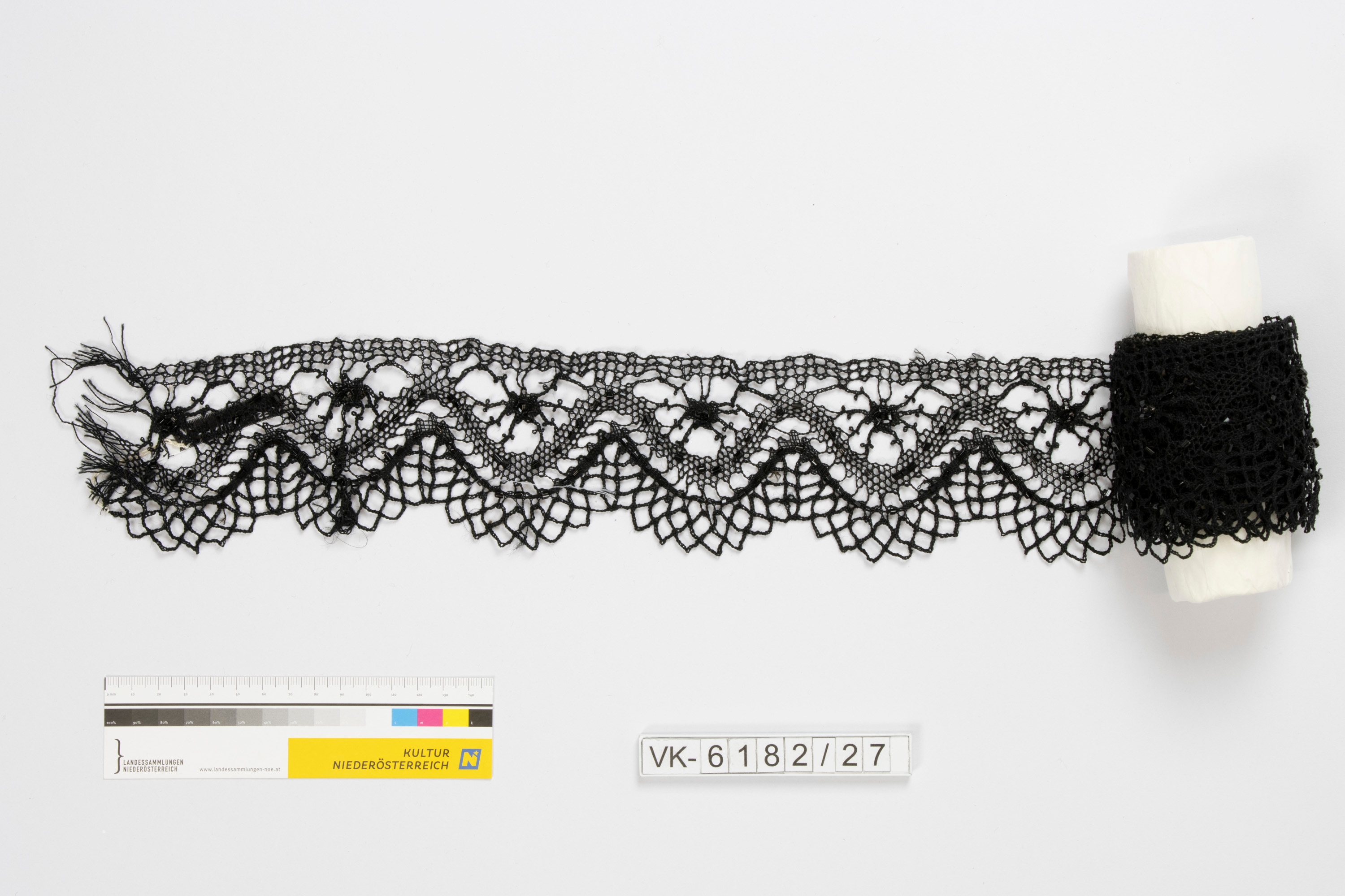 Häkelspitzenband mit wellenförmig verlaufendem Muster und aufgestickten schwarzen Glasperlen.