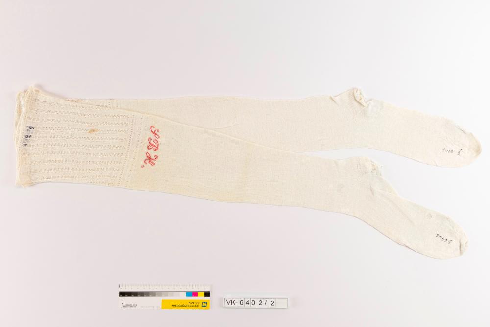 Ein Paar (zusammen genäht) weiße gestrickte Damenstutzen, im oberen Bereich in durchbrochenem Muster gestrickt. Die Stutzen sind mit rotem Garn bestickt: "S B H".