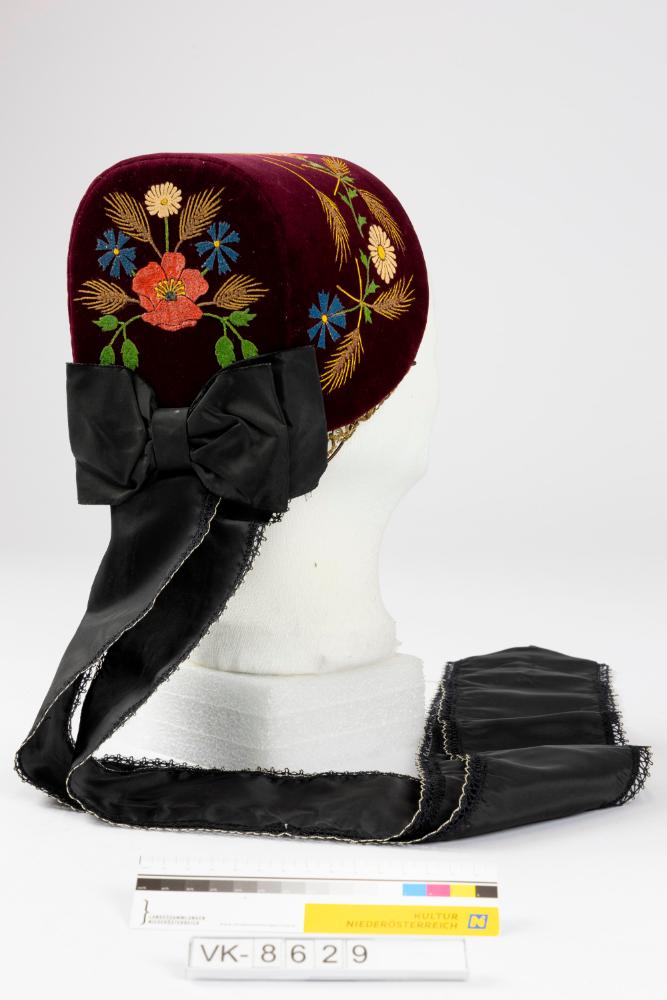 Kleine weinrote Bodenhaube (Mädchenhaube) aus Samt, mehrfärbig floral bestickt (Blüten und Ähren). Die Haube hat ein breites schwarzes Taftband, zu einer Masche gebunden, das an den Kanten mit einer Zierborte besetzt ist. Die Haube ist mit gemustertem Baumwollstoff gefüttert und mit einer Goldborte besetzt.