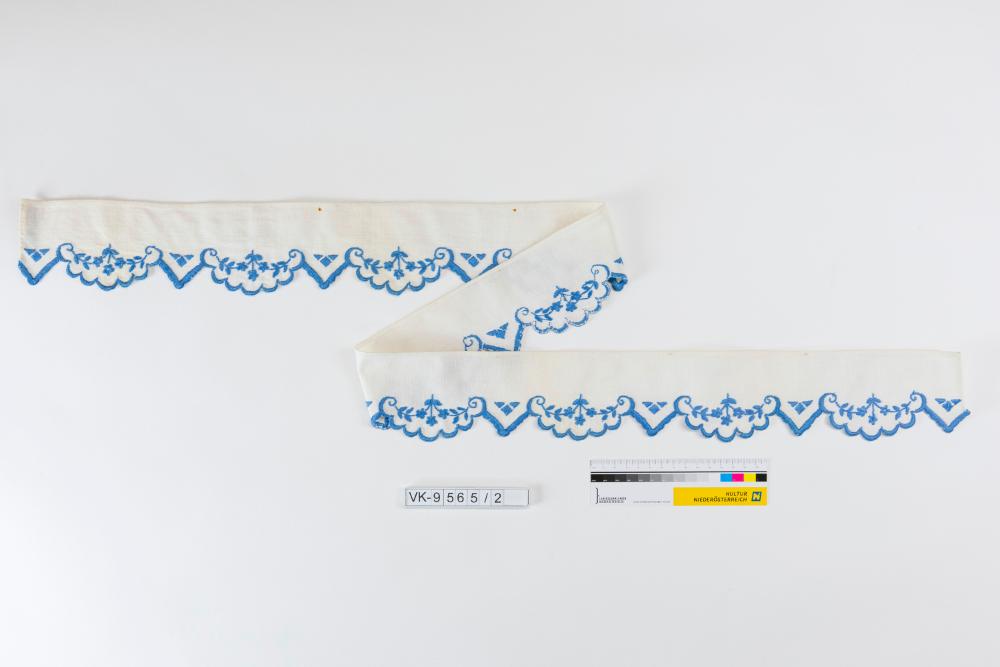 Weißes Kastenband aus Leinen ("Kastenspitze"), mit abwechselnd Zacken und geschwungenen Bogenreihen. Das Band ist mit blauem Garn bestickt (floral).