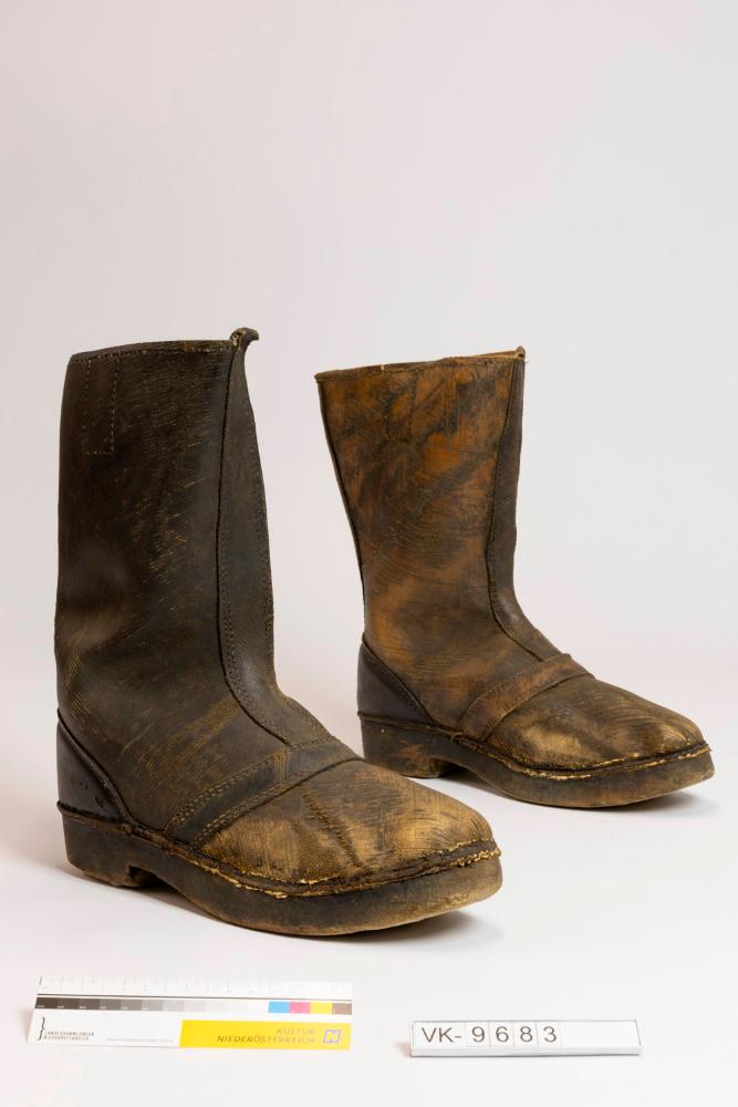 Ein Paar (a, b) halbhohe Schaftstiefel (Weinbergstiefel) mit Holzsohle.