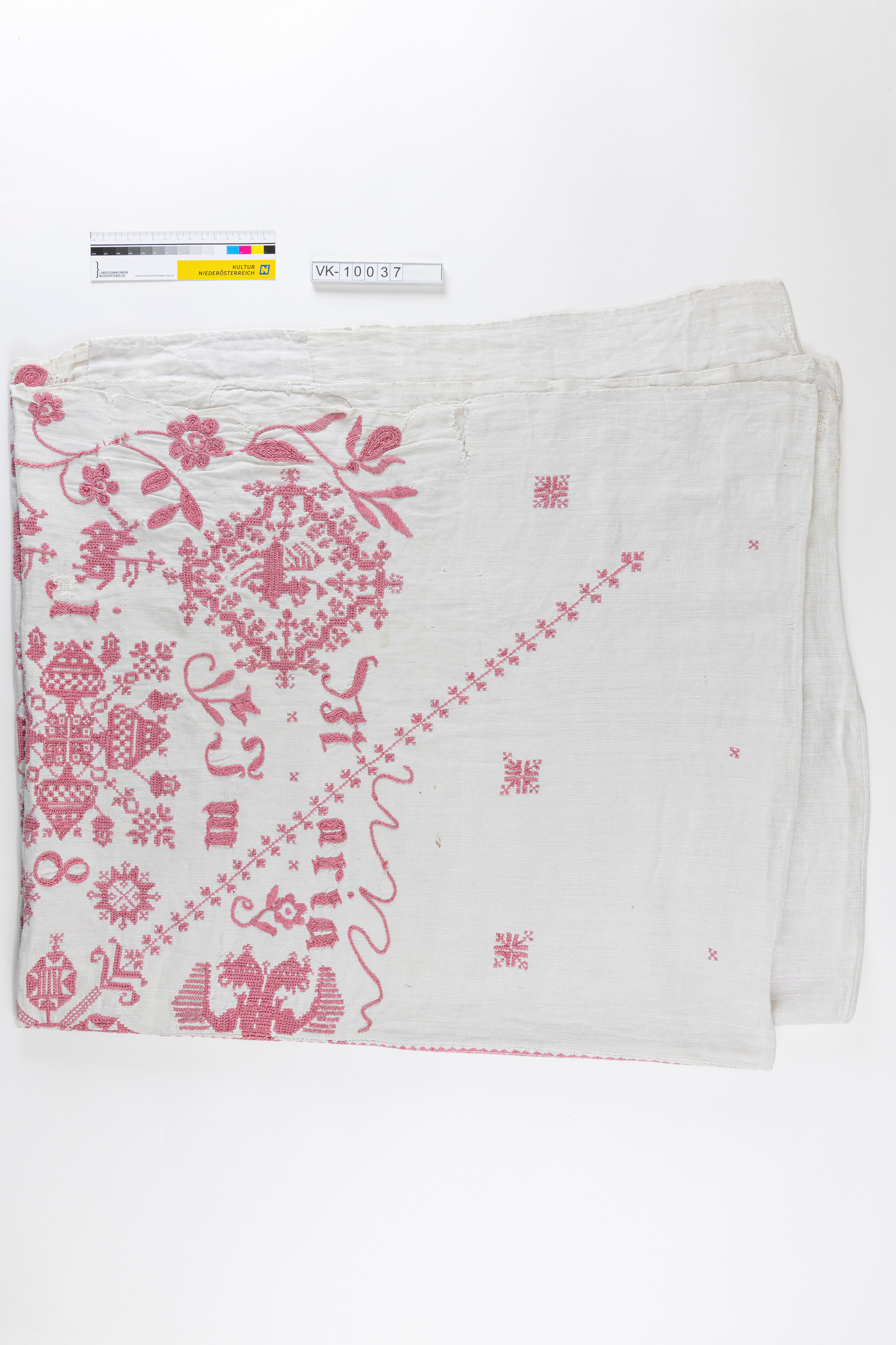 Weißes Leinentuch, bestickt mit hellrotem Garn: Verschiedene florale und ornamentale Muster, Tiere und Zierborten, "Maria Schüller Im Jahr 1861".
