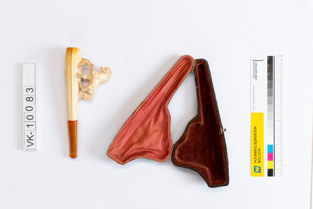 Konischer Zigarrenspitz aus Elfenbein mit einem Mundstück aus Bernstein in einem gefütterten, klappbaren Lederetui; auf dem Zigarrenspitz ist eine großteils frei stehende Pferdefigur dargestellt.