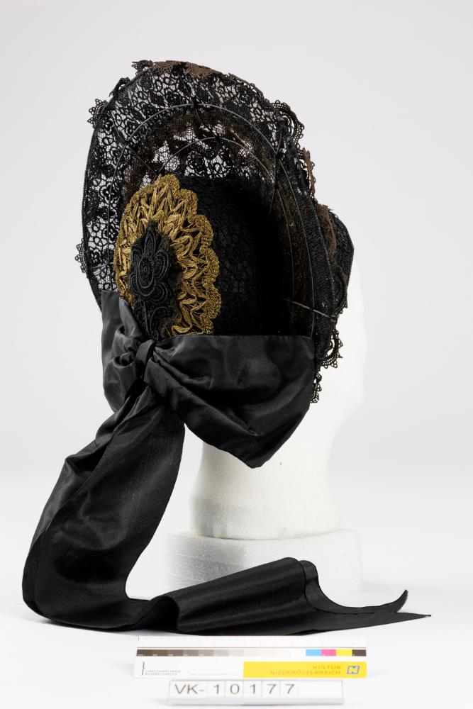 Radhaube mit goldspitzenverziertem Boden, drahtverstärktem Rad aus schwarzer Spitze und einem Futter aus schwarzem Taft. Die Haube hat vorne einen Goldspitzenabschluss und hinten eine schwarze Schleife mit Bändern. Laut Inventarbuch handelt es sich um eine Retzer Stockhaube, die Beschreibung stimmt aber teilweise nicht ganz überein. Laut Inventarbuch wäre es ein Ankauf vom Niederösterreichischen Heimatwerk um ATS 14.000.-
