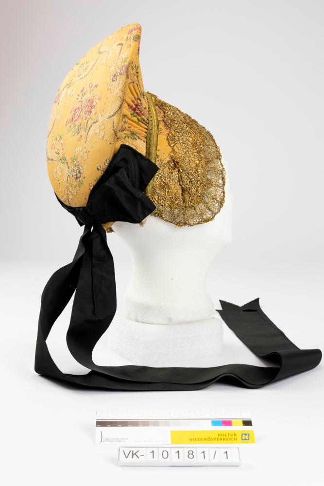 Wachauer Haube (Brettlhaube) mit großem Bodenteil (Brettl), aus floral gemustertem Goldbrokat; am Kopf bzw. an der Krempe eine Goldborte und Goldspitzenbesatz. Die Haube hat eine lange schwarze Ripsschleife und goldbraunes Seidenfutter.