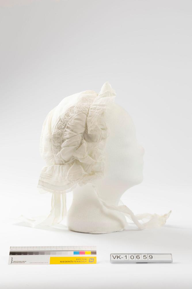 Weiße Haube aus Seidenbatist mit Spitzenbesatz und weißen Bändern, mit floraler Stickerei verziert.