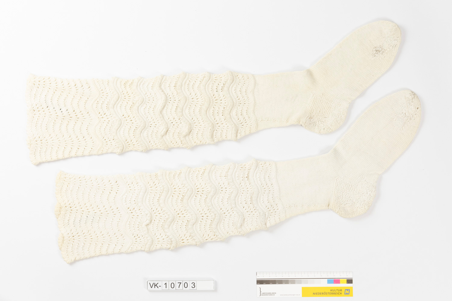 Ein Paar weiße Baumwollstutzen (a, b) mit Wellenmuster am Schaft. Gestopft.
