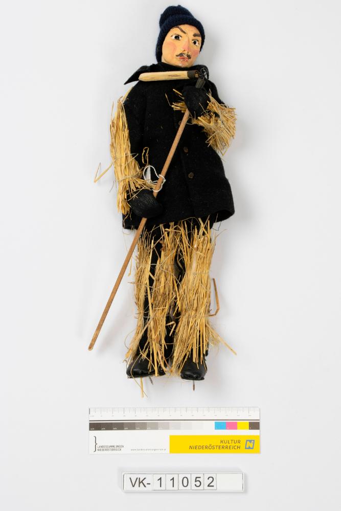 Drescherfigur ("Winter") in schwarzer Wollkleidung (Jacke und Hose), an Armen und Beinen mit Stroh umwickelt, mit einer Mütze, Fäustlingen und einem Dreschflegel. An den schwarzen Schuhe hat die Figur Nägel zur Befestigung an einem Sockel.