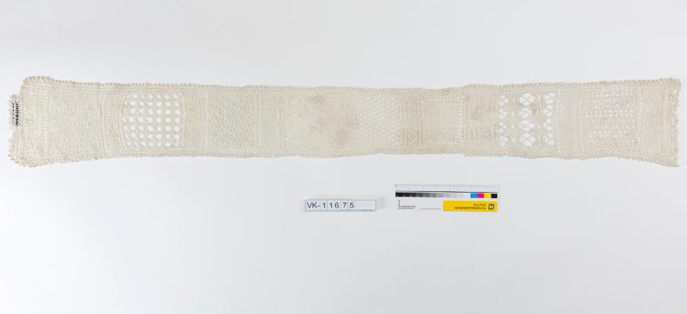 Beiges Musterband mit verschiedenen, großteils durchbrochen ausgeführten, geometrischen Mustern, am Rand mit einer durchgehenden Borte.