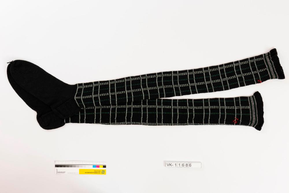 Ein Paar (zusammen genäht) lange, schwarze Herrenstrümpfe aus Wolle, mit grünen und weißen Linien kariert gemustert und mit rotem Garn bestickt: "31".