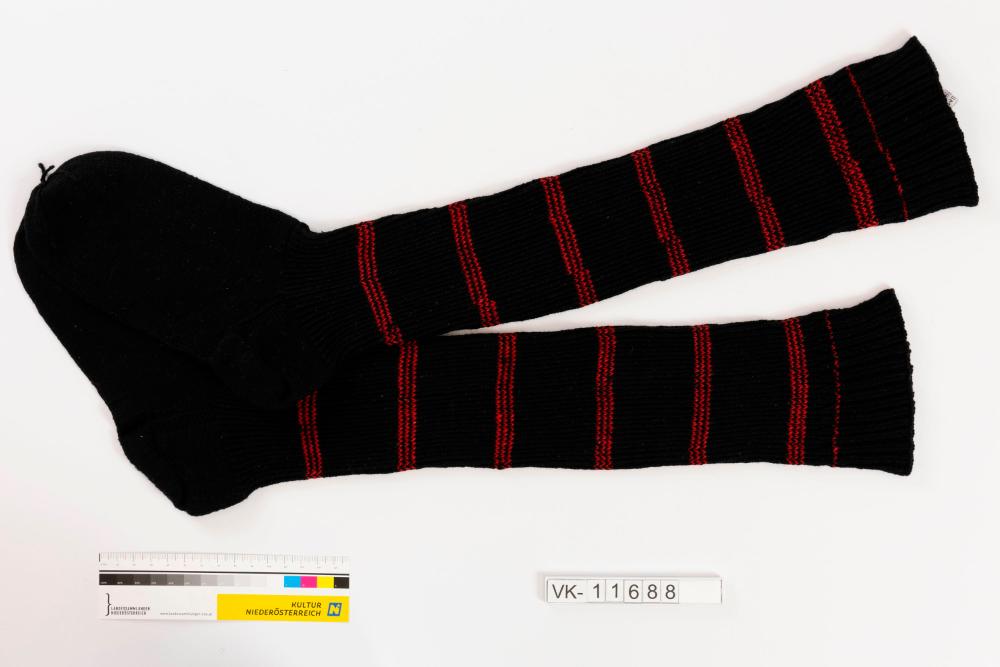 Ein Paar (zusammen genäht) schwarze Herrenstrümpfe mit roten Streifen.