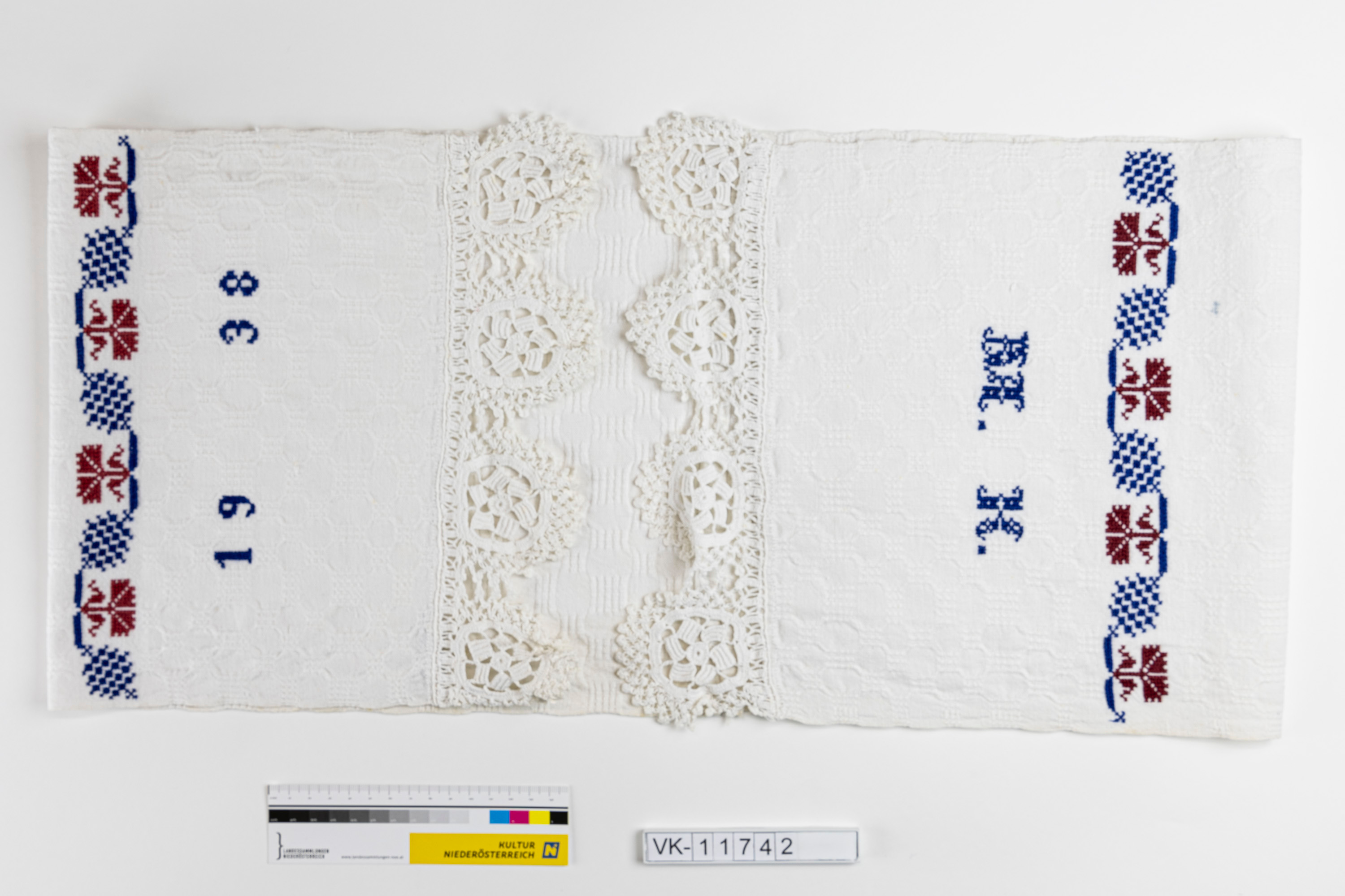 Längliches weißes Deckchen (möglicherweise Handtuch oder Tischläufer), an beiden Schmalseiten mit einer in Rosetten gestalteten Spitze besetzt, an den Enden je eine rot-blaue gestickte Zierborte, einmal mit "M.K.", einmal mit "1938".