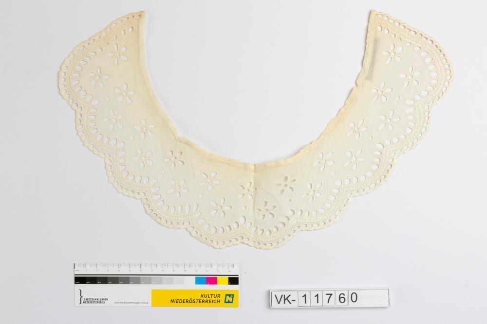 Gewellter weißer Spitzenkragen, in Knopflochstich mit einem einfachen Blütenmuster bestickt.