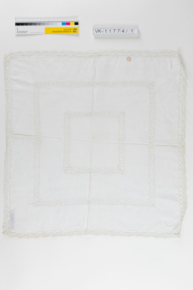 Annähernd quadratisches weißes Leinendeckchen mit zwei Spitzenborteneinsätzen und umlaufendem Spitzenbesatz.