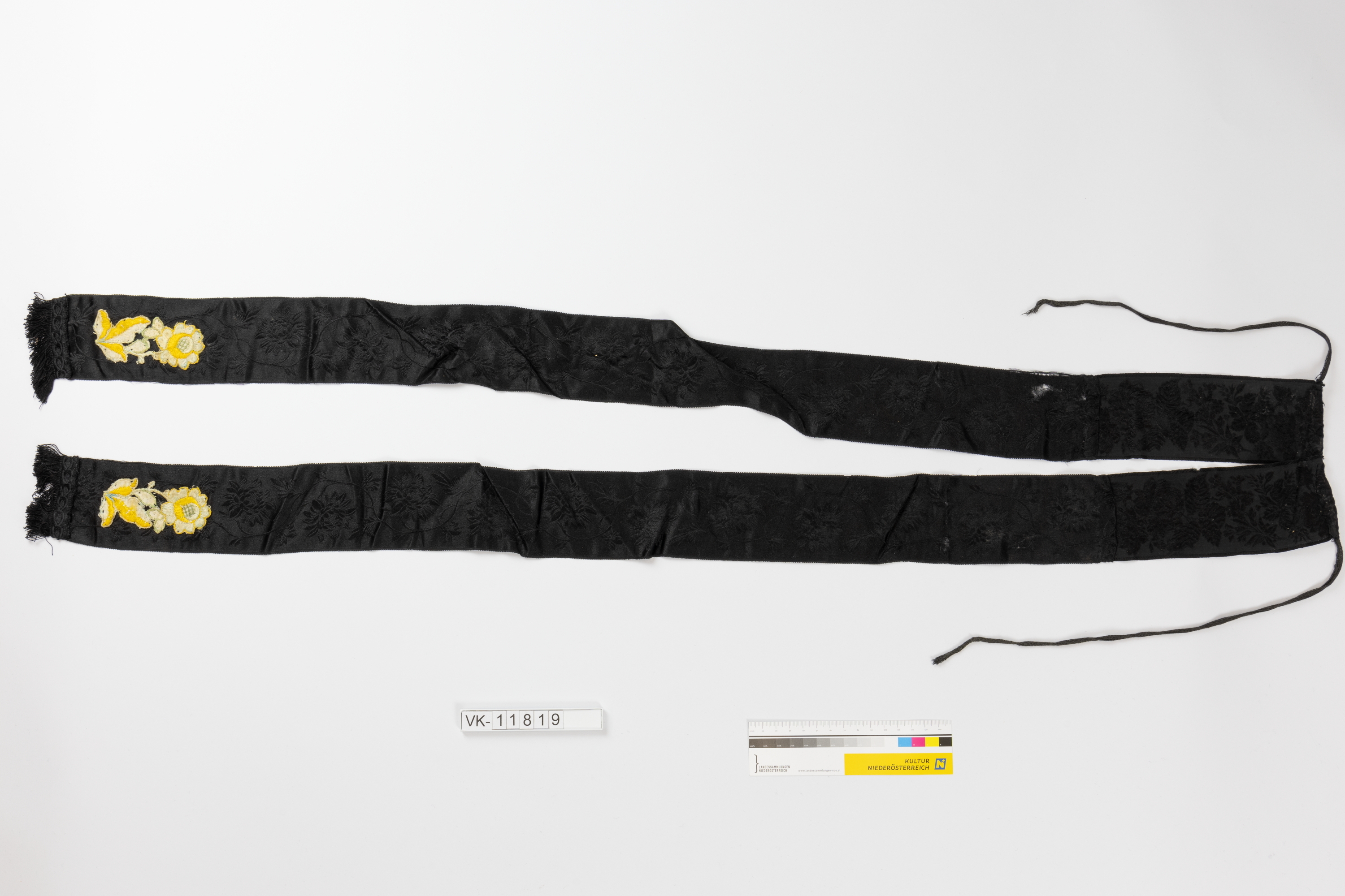 Zierband einer siebenbürgener Tracht aus schwarzem Brokatstoff, zwei Bandelementen mit je einer Blütenstickerei am Ende und einem Zugbändchen zum Anbinden.