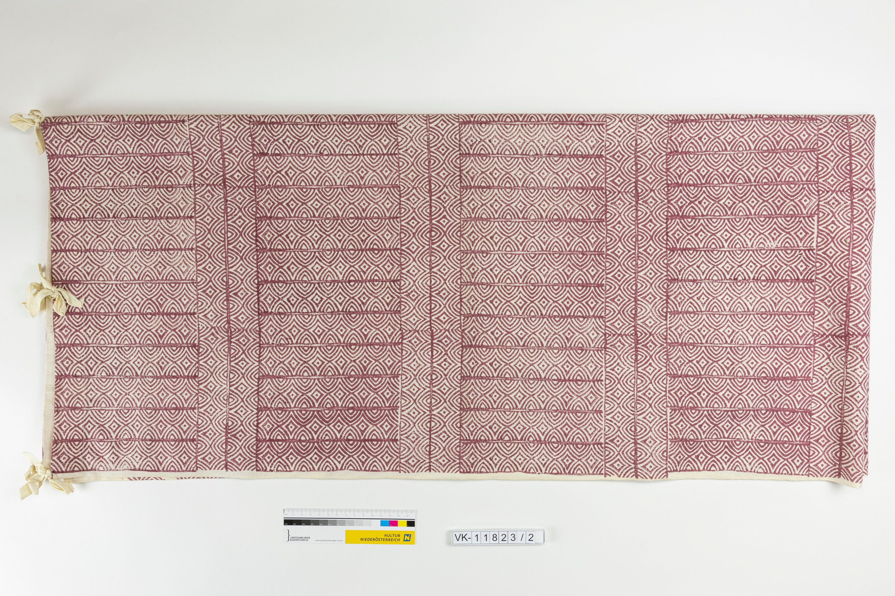 Beiger Leinenvorhang mit Köperbändern zum Binden, vollflächig mit geometrischen Musterelementen (abwechselnd horizontal und vertikal verlaufend) in rot bedruckt.