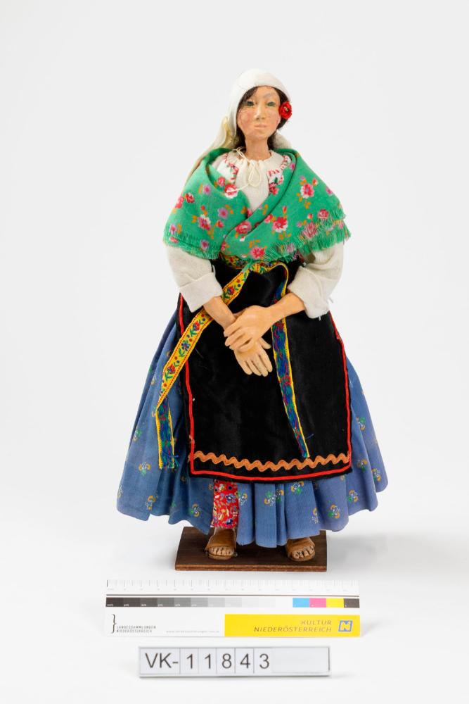 Frauenfigur (Dodolafigur, Dodola ist ein südslawischer Frühlingsbrauch) mit geblümtem blauem Rock, weißer Bluse mit grünem geblümtem Schultertuch, einer schwarzen Schürze mit Wellenborte, einem weißen Kopftuch und einer roten Blume im Haar. Die Figur trägt Pantoffeln und ist auf einer kleinen Holzplatte befestigt.