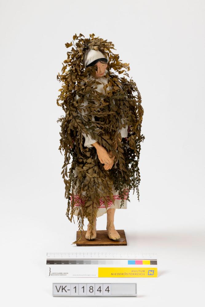 Frauenfigur (Dodolafigur, Dodola ist ein südslawischer Frühlingsbrauch) mit weißer Kleidung und weißem Kopftuch. Die Figur ist barfuß dargestellt und am ganzen Körper mit Blätterzweigen behängt. Die Figur hat ein kleines Holzbrettchen als Sockel.