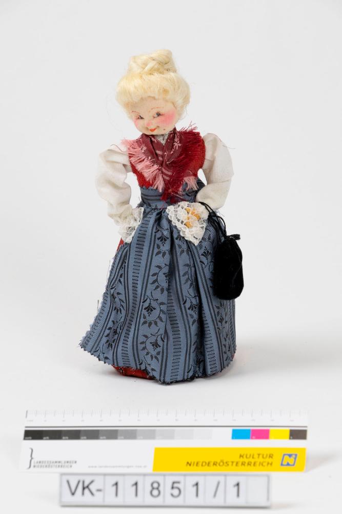 Frauenfigur (Dodolafigur, Dodola ist ein südslawischer Frühlingsbrauch) mit langer Trachtenkleidung in blau und rot, an den Ärmeln mit Spitzenbesatz. Die Figur hat hochgesteckte weißblonde Haare und eine schwarze Handtasche. Der Kopf ist mit Stoff bezogen und ausgestopft.