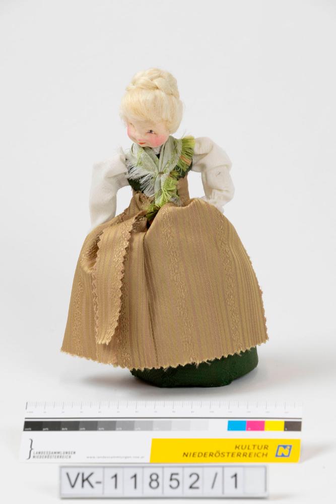 Frauenfigur (Dodolafigur, Dodola ist ein südslawischer Frühlingsbrauch) mit langem Brokatkleid und aufgesteckten weißblonden Haaren. Der Kopf ist mit Stoff bezogen und ausgestopft.