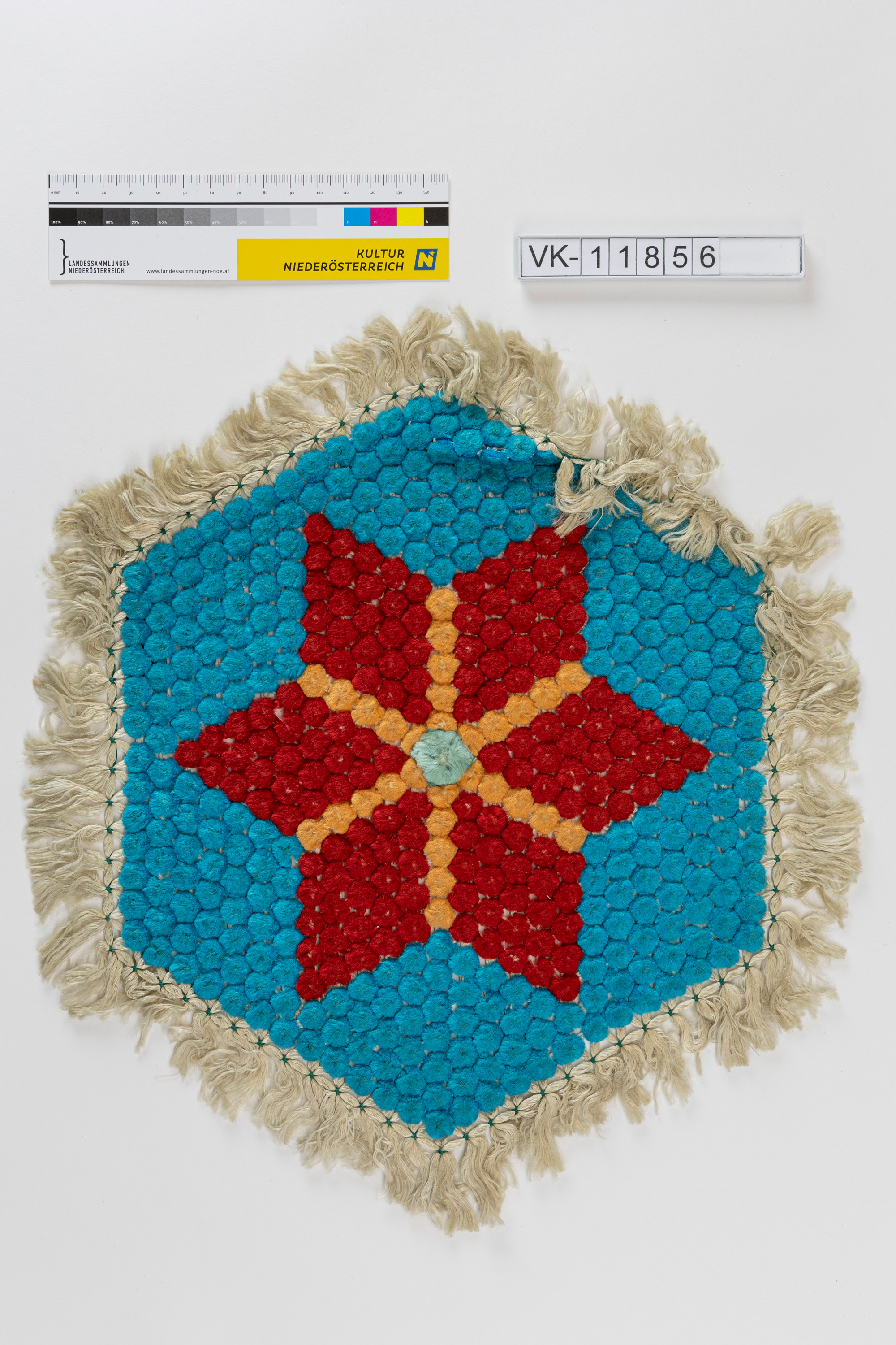 Geknüpftes sechseckiges Deckchen, blau mit rot-orangem Sternmotiv, mit umlaufenden beigen Fransen.