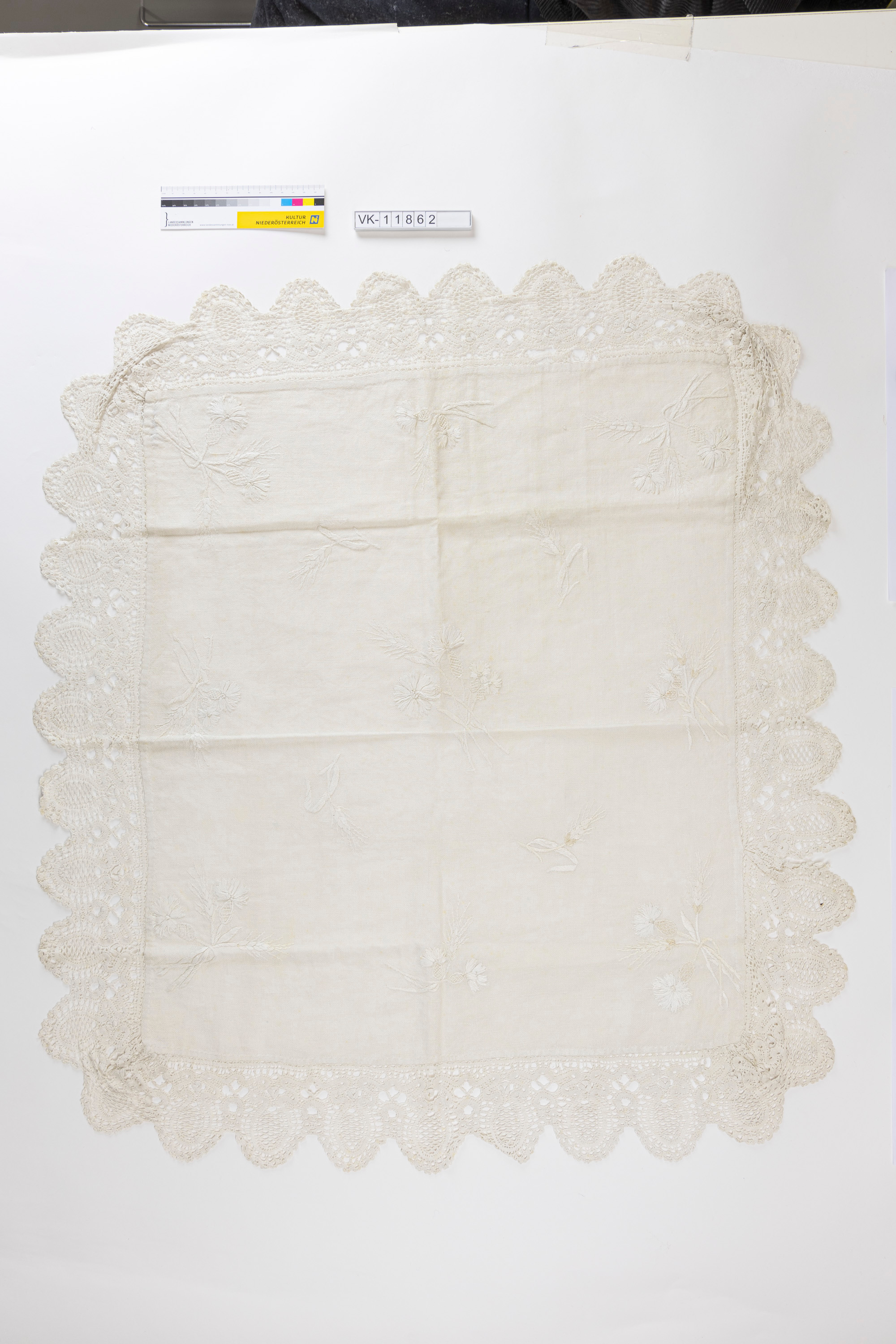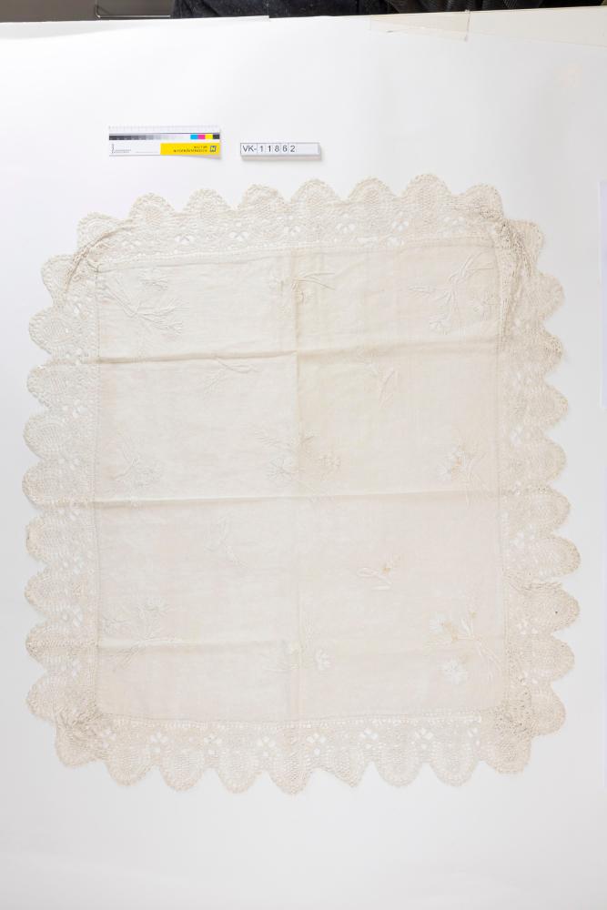 Weißes Leinendeckchen, mit weißem Garn mit verschiendenen floralen Motiven bestickt, umlaufend mit einer breiten Klöppelspitze mit Bogenmuster besetzt.