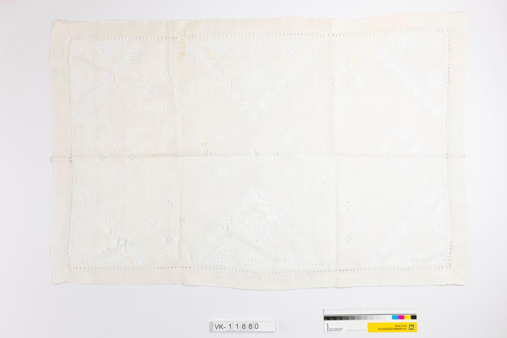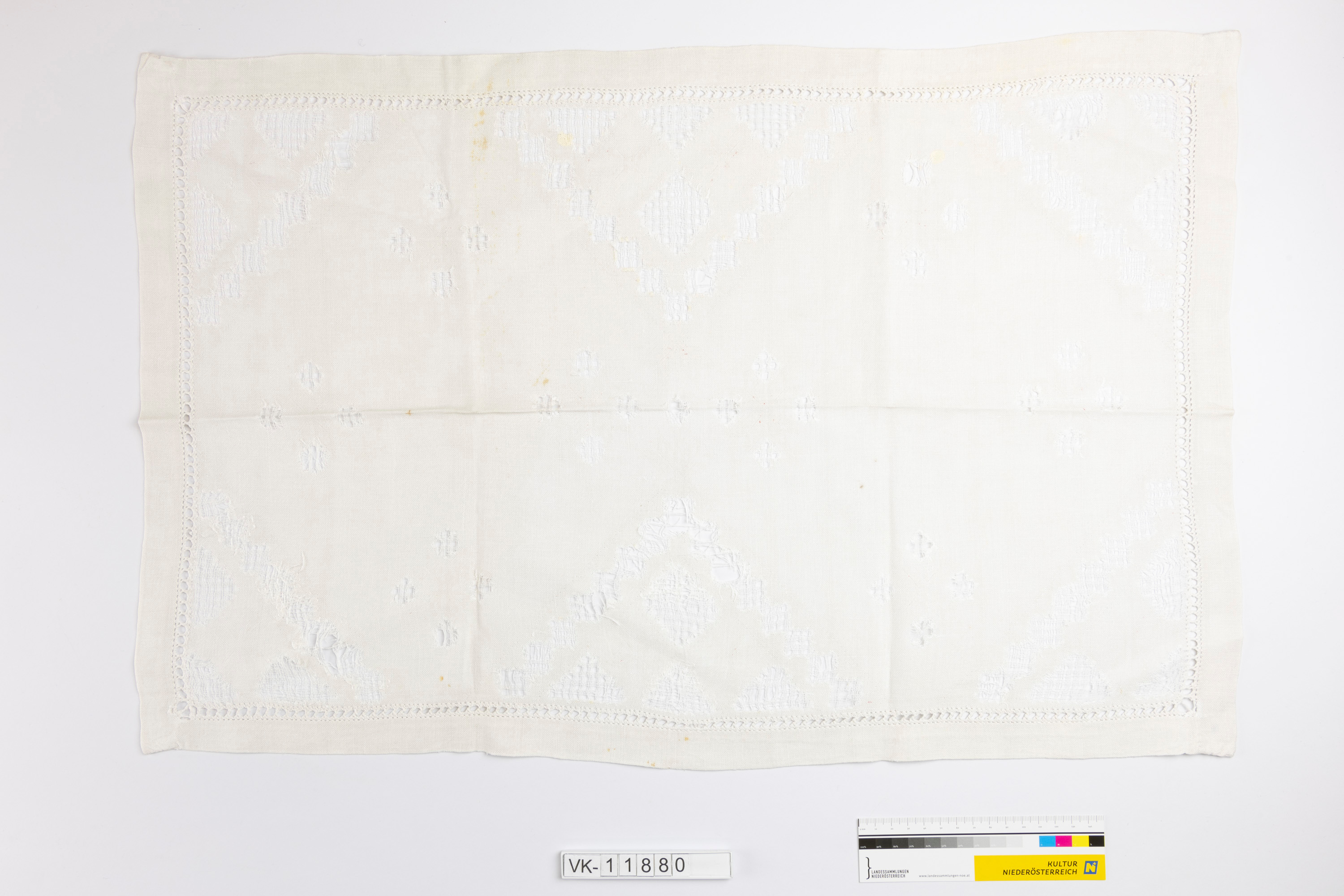 Rechteckiges weißes Leinendeckchen mit durchbrochenen geometrischen Verzierungen in Ajourstickerei.