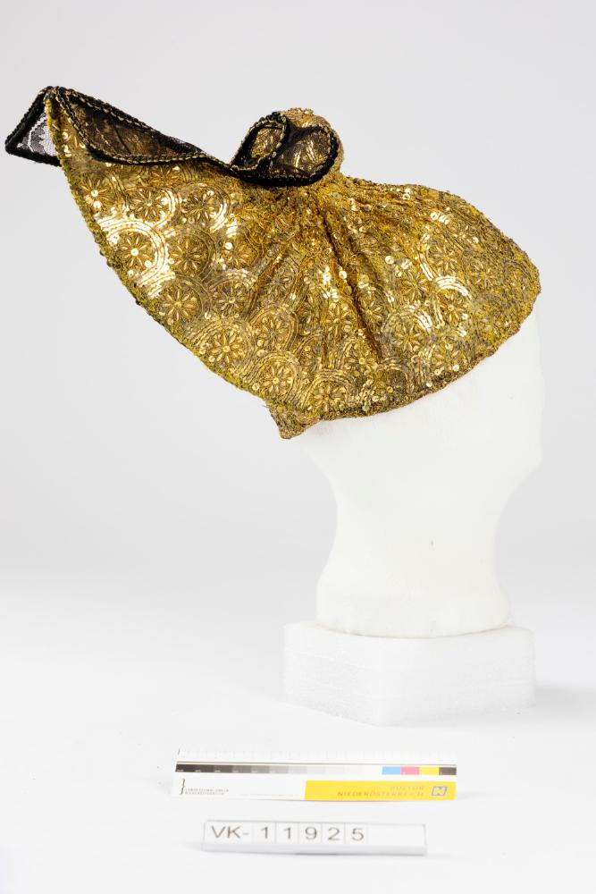Drahtverstärkte Goldhaube (Linzer Haube), vollflächig mit Golddrahtstickerei, Pailletten und Goldkügelchen besetzt (Muster ornamental-floral). Die Haube hat ein goldgelbes Taftfutter, unter dem Böndel ist eine schwarze, mit Draht verstärkte Tüllspitzenschleife befestigt.