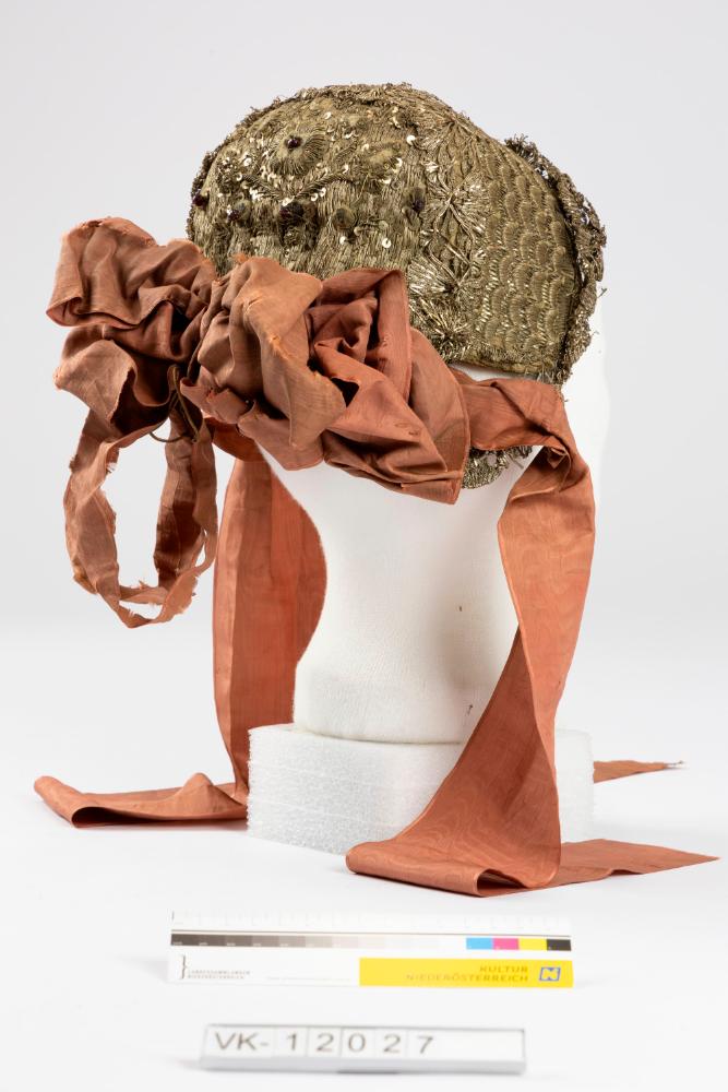 Bodenhaube (weiche Haube), vollflächig mit Golddrahtstickerei und Goldborte besetzt. Die Haube hat ein Futter aus braunem Leinenstoff, einen Nackenzug und eine rotbraune Seidenschleife mit langen Bändern. An der Vorderkante ist die Haube mit einer Goldspitzenborte besetzt.
