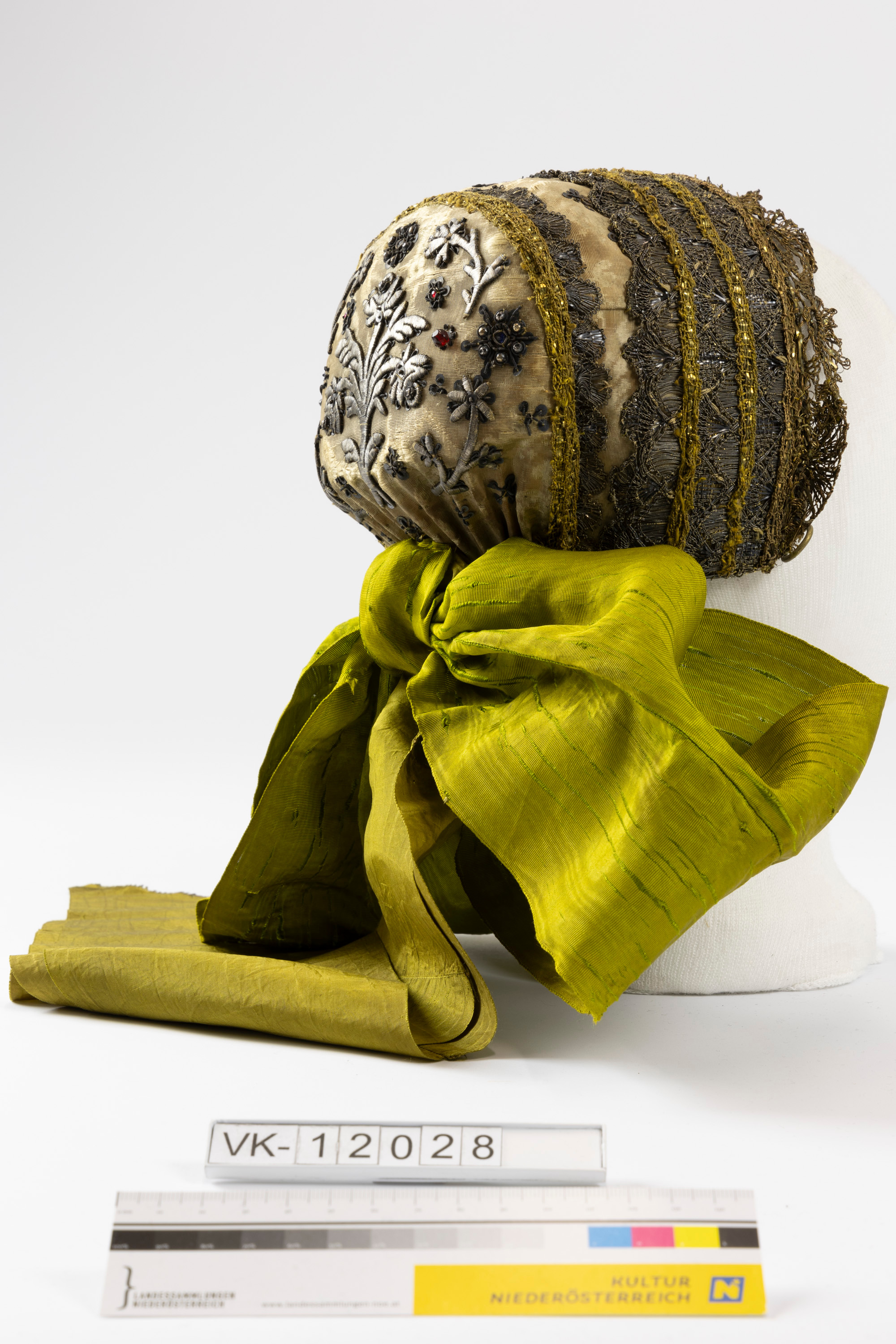 Bodenhaube aus beigem Stoff, mit Silberfaden floral bestickt, im Nacken gezogen, mit einer sehr breiten und großen gelben Seidenripsschleife. Die Haube ist mit Leinen gefüttert, mit Goldborte besetzt und auf dem Kopf mit Pailletten bestickt.