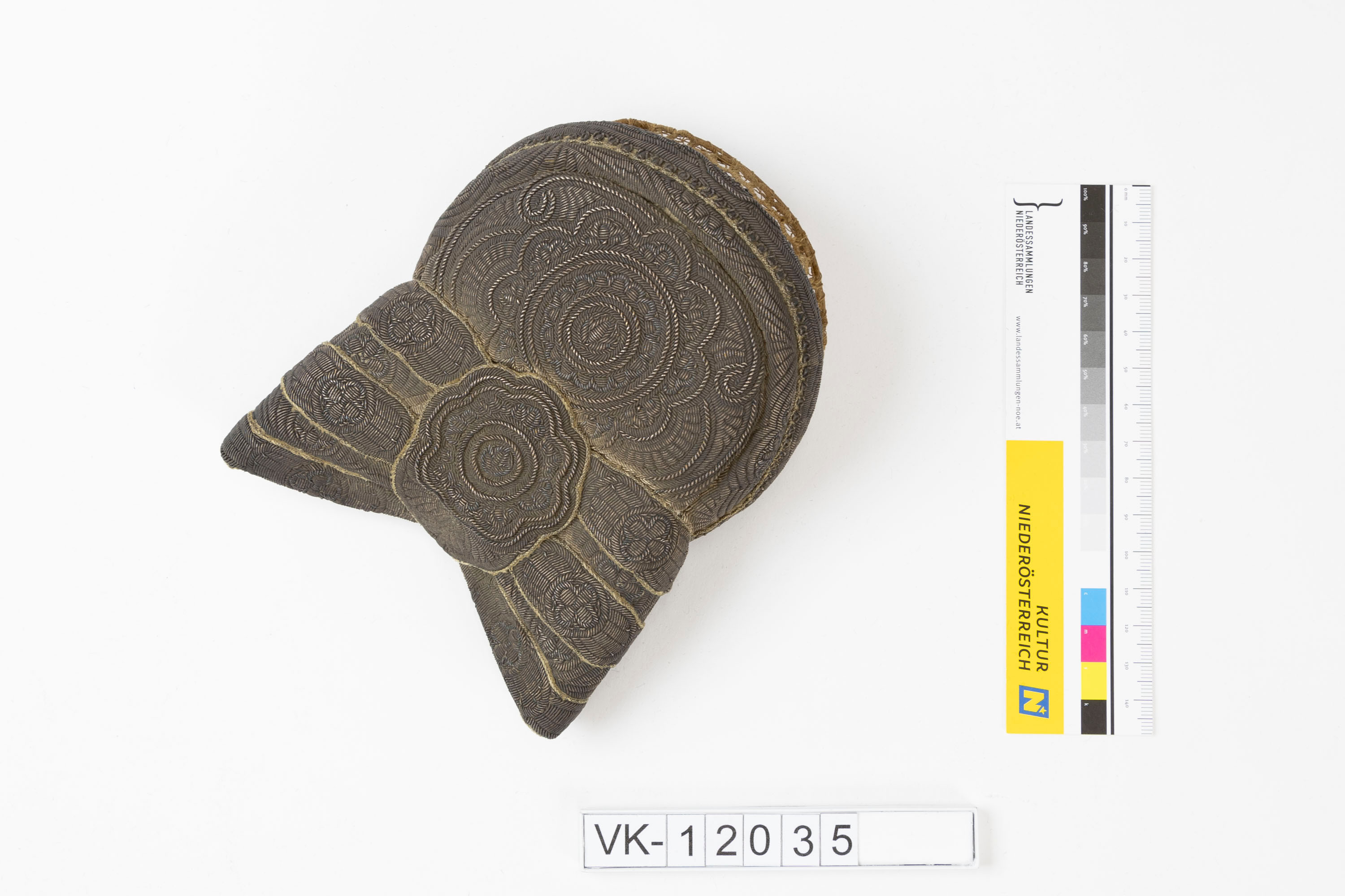 Kleine, mit Drahtstickerei verzierte, flache Riegelhaube für Kinder mit einem rot gemusterten Futter und einem roten Bindebändchen.