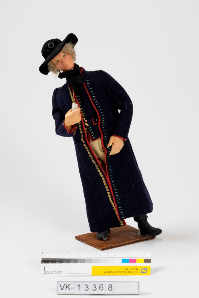 Männerfigur (Trachtenpuppe) mit dunkelblauem Mantel, schwarzen Stiefeln, beiger Hose und einem schwarzen Hut. Die Figur hält in einer Hand, stellt die Tracht aus Pilsen dar und ist auf einem kleinen Holzbrettchen befestigt.