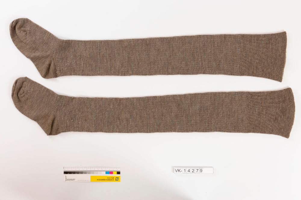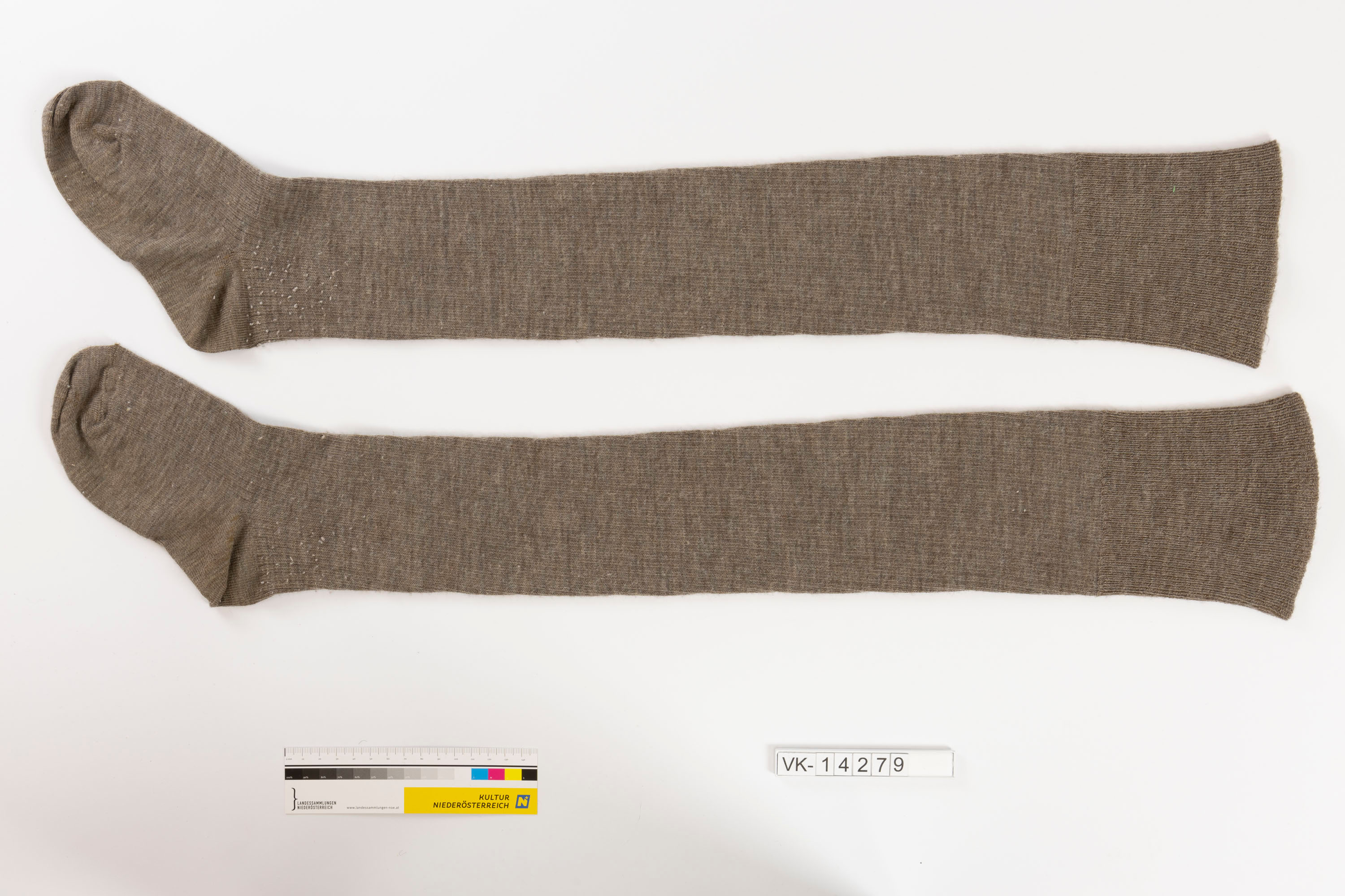 Ein Paar (a, b) graubraune Damenstrümpfe.